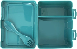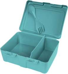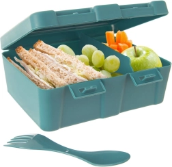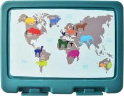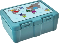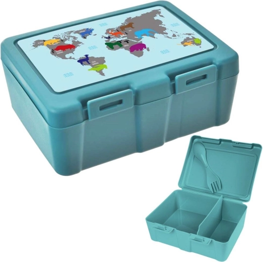 Dos prácticos compartimentos permiten separar el plato principal de las guarniciones o la fruta. Los fuertes clips laterales evitan aperturas indeseadas y el derrame del contenido, por lo que puedes confiar en mantener limpia la mochila o el bolso. El atractivo diseño turquesa con mapa del mundo y animales motiva a meriendas más saludables y gusta a pequeños y mayores.