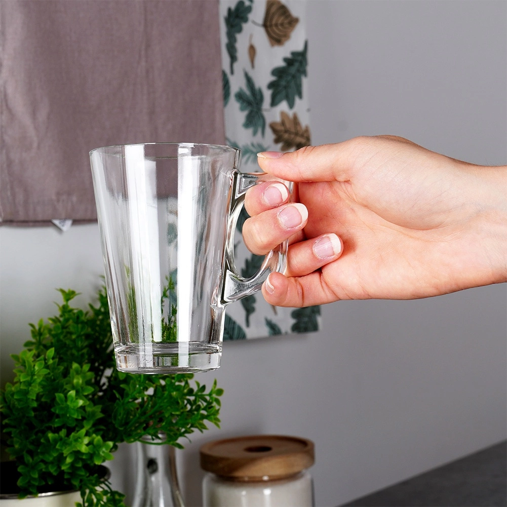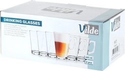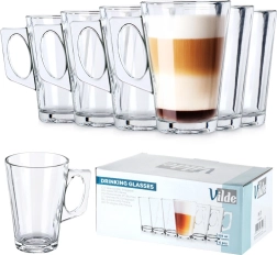 Elegante juego de seis vasos para latte con capacidad de 255 ml y cómoda asa. Fabricados en vidrio resistente de paredes gruesas, aptos para bebidas calientes y frías, con posibilidad de lavado en lavavajillas y uso en microondas. Ideales para cafés, tés, agua y limonadas: una excelente opción para el hogar y la hostelería.