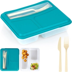 Este lunchbox compacto con división en 3 partes mantiene el plato principal, la ensalada y el snack claramente separados. La tapa en color turquesa incorpora prácticos cubiertos —cuchillo y tenedor— para que lo tengas todo a mano estés donde estés. El diseño sin BPA es respetuoso con tu salud y con los alimentos.