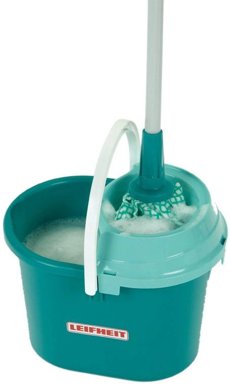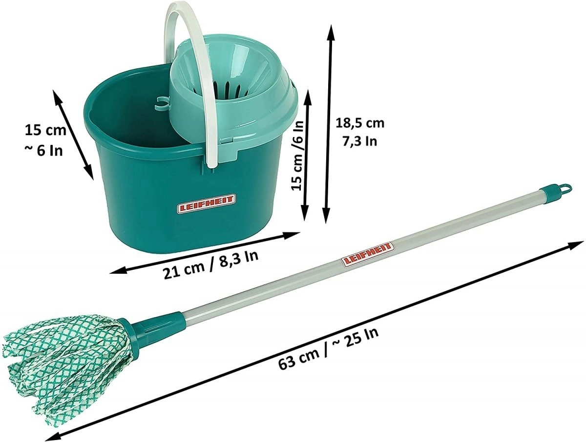 Set realista para pequeños ayudantes en el hogar: cubo infantil con escurridor encajable y fregona de tiras con licencia de LEIFHEIT de la marca KLEIN. Adecuado para imitar a los adultos, fabricado con materiales resistentes y se puede usar con agua para un juego aún más auténtico.