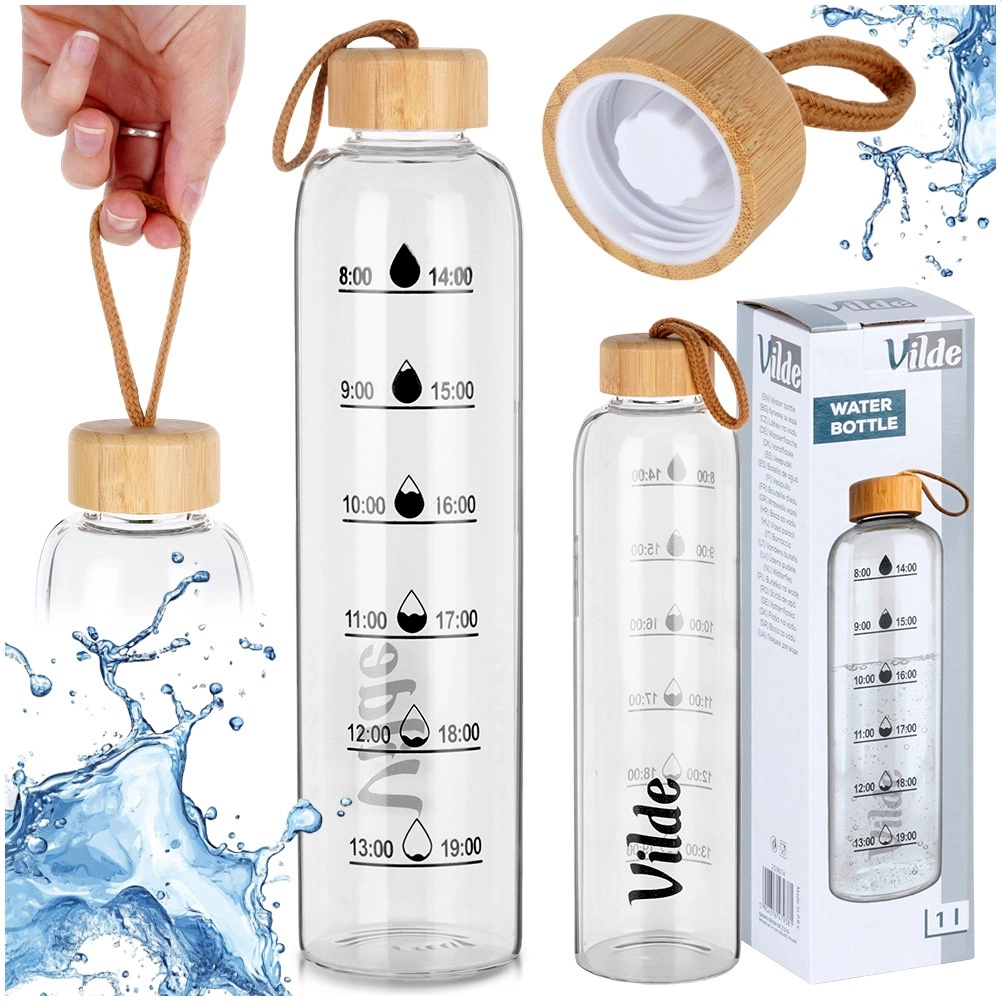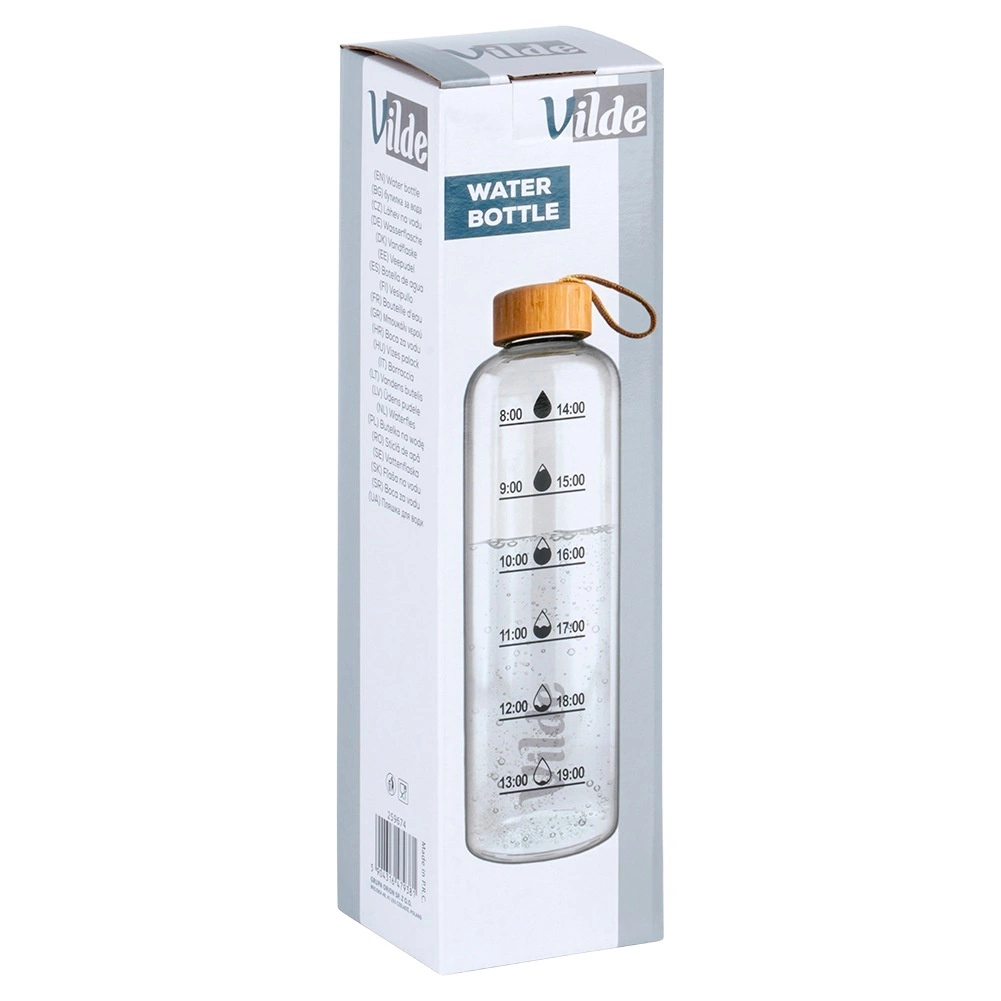 La botella de vidrio VILDE ofrece un diseño limpio y prestaciones prácticas para el día a día. Fabricada en vidrio de borosilicato, ligero, resistente y capaz de soportar cambios de temperatura, para que disfrutes de agua, té o limonadas caseras. La tapa de bambú con junta de silicona mantiene el contenido de forma segura en el interior y, gracias al asa, se transporta con facilidad.
