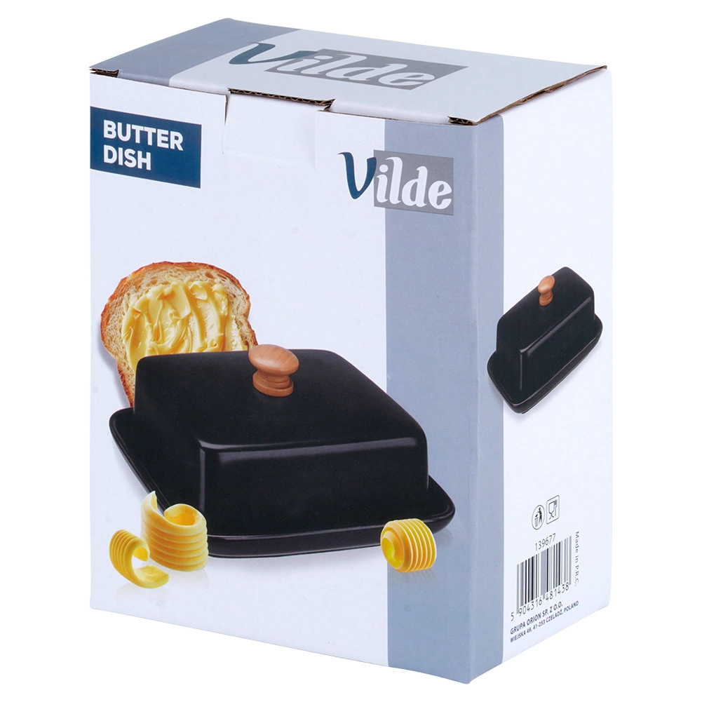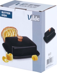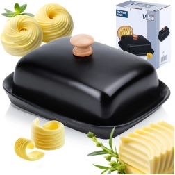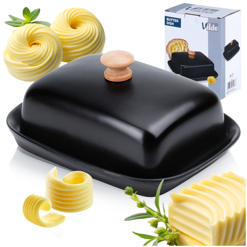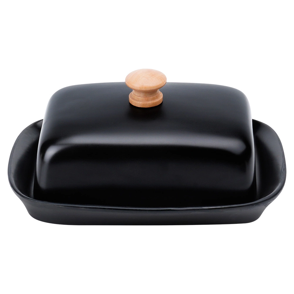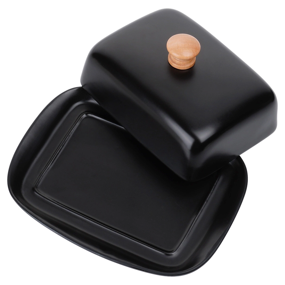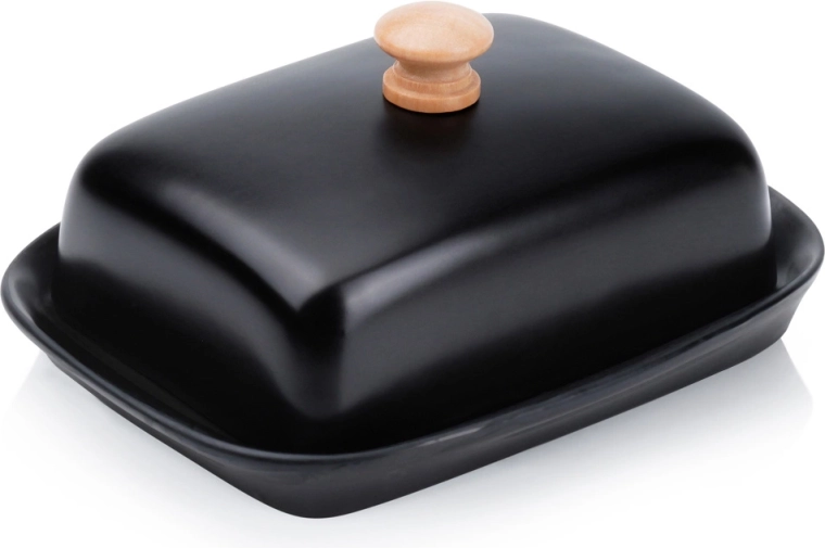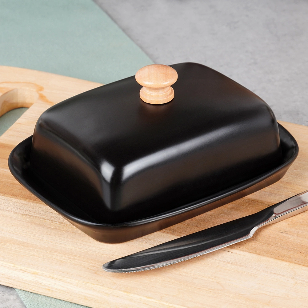Esta estilosa mantequera de cerámica de alta calidad en color negro es ideal para el uso diario en casa y para servir en la mesa. El asa de madera en la tapa permite levantarla con comodidad, mientras que la cubierta que ajusta firmemente protege la mantequilla del resecamiento y de olores extraños.