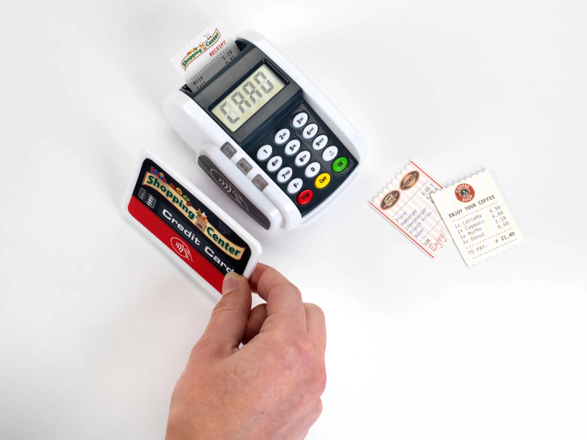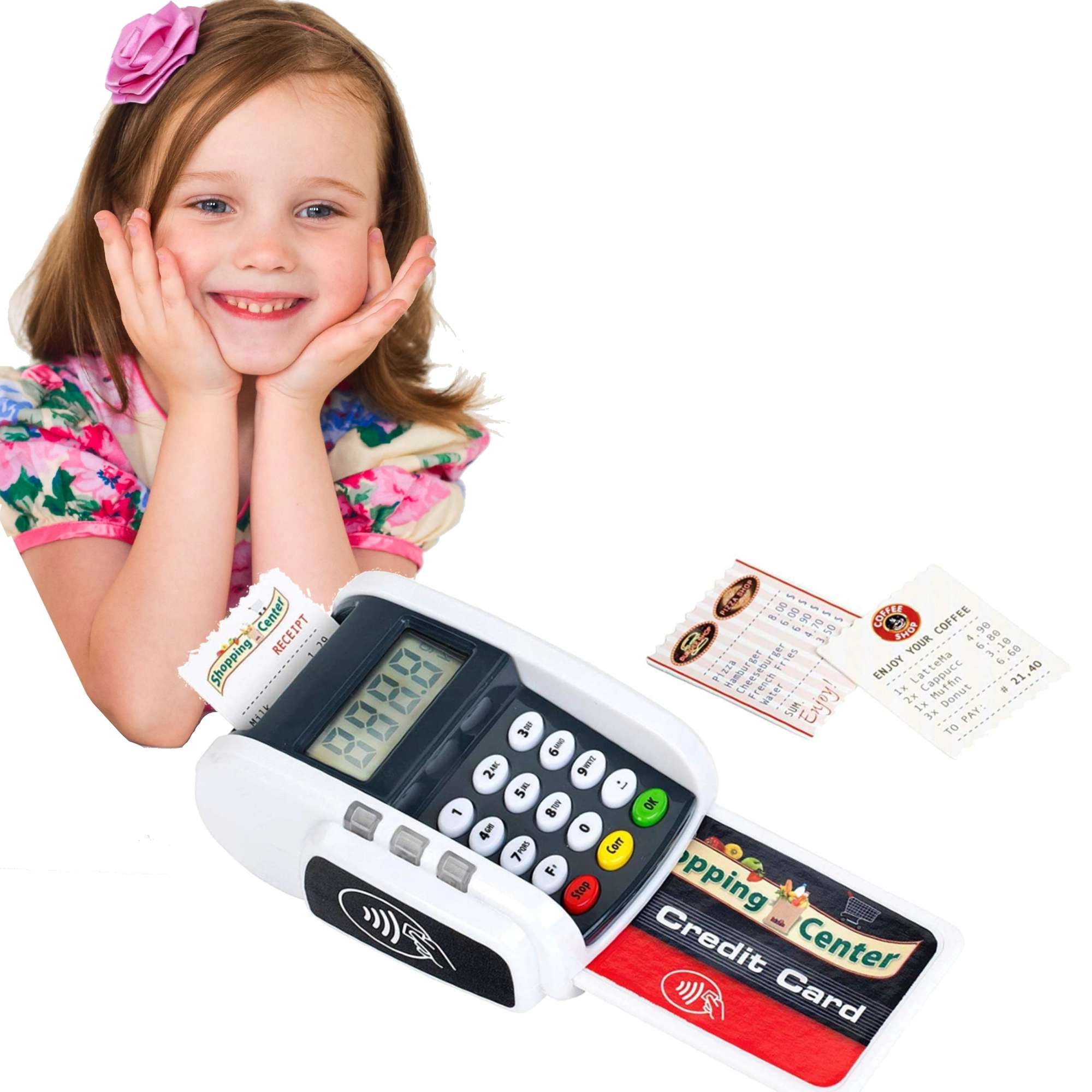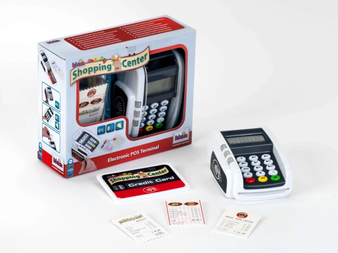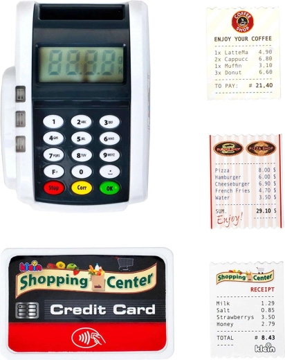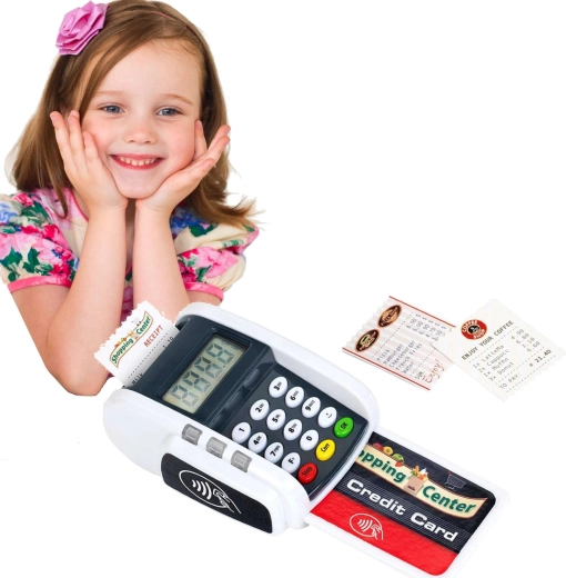 Este terminal compacto imita fielmente un dispositivo real: los niños pueden pulsar el teclado numérico, acercar la tarjeta de pago e imprimir “recibos” para un juego de caja registradora realista. Los efectos de luz y sonido aportan a cada transacción el toque justo de realidad y fomentan el desarrollo de habilidades sociales.
