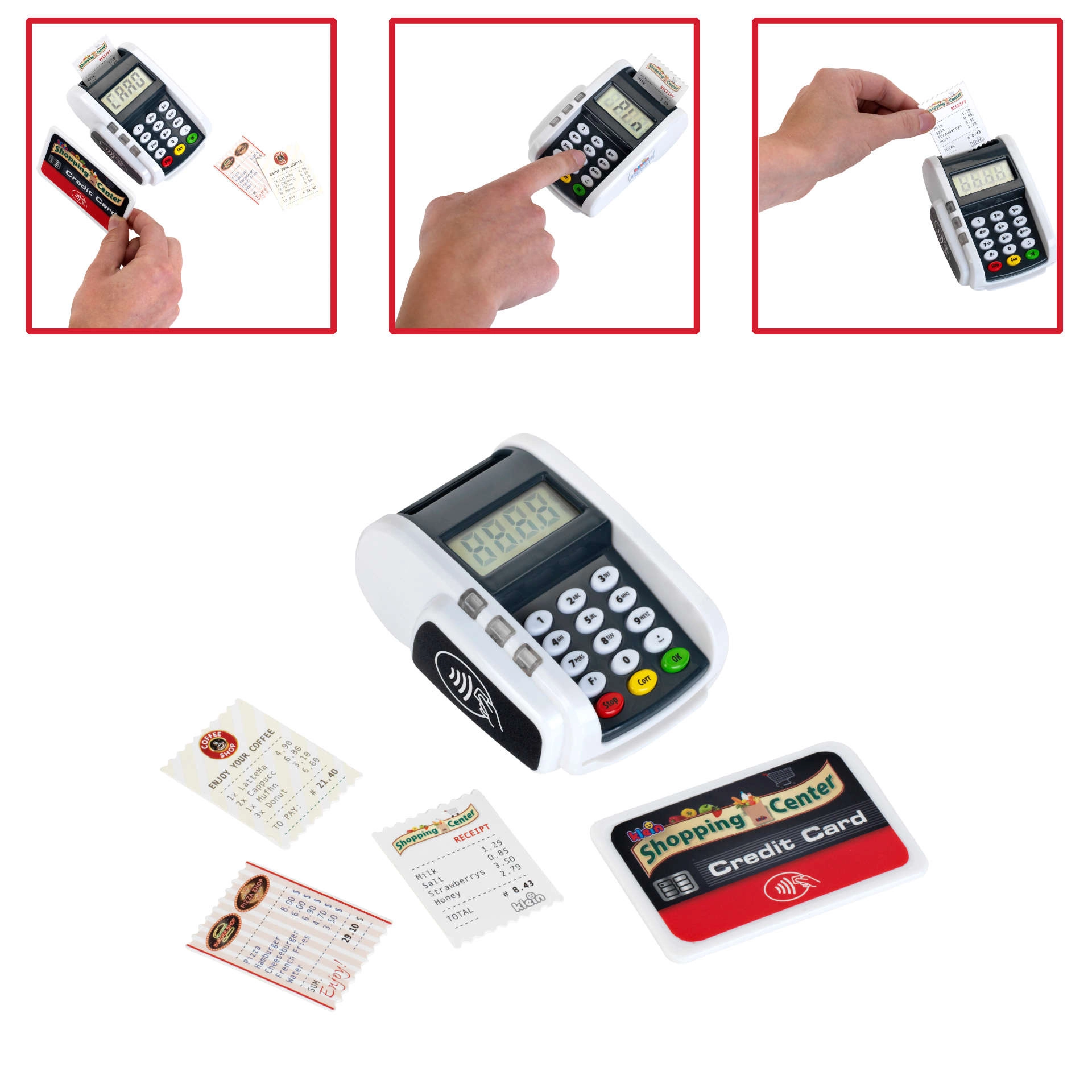 Los niños pueden probar a acercar la tarjeta y a pulsar el teclado: ideal para jugar a cajeros.