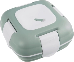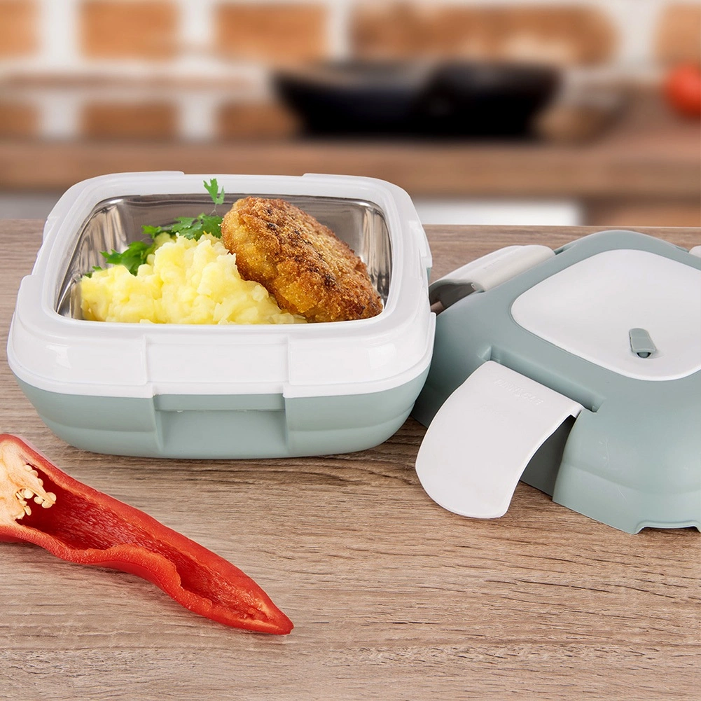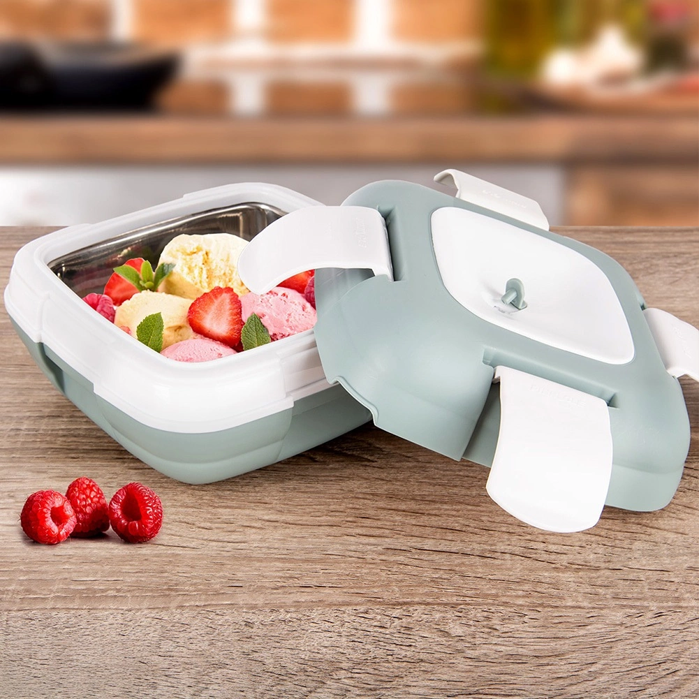 Gracias a los cuatro clips de cierre y al sellado de calidad, el recipiente es hermético y a prueba de fugas. Puedes usarlo como termo bol para sopas y salsas calientes, así como para platos fríos o helado en verano. Su diseño ligero es cómodo de llevar y las dimensiones compactas de 17,5 × 17,5 × 9,5 cm ahorran espacio en la bolsa.