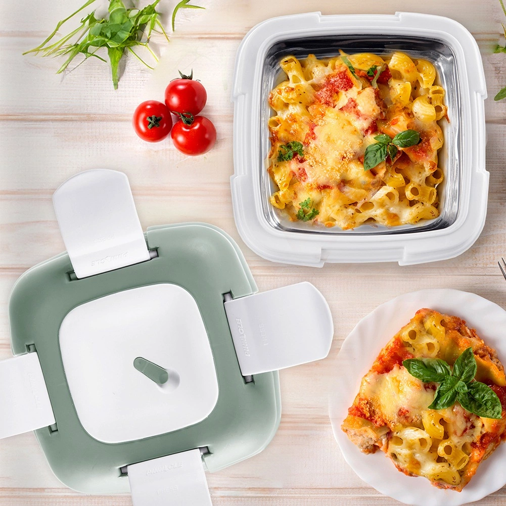 El interior de acero inoxidable mantiene los platos calientes o fríos por más tiempo y, además, se limpia fácilmente.