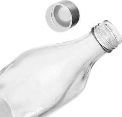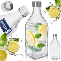 La estilosa botella transparente de vidrio de alta calidad es perfecta para servir y almacenar bebidas. La tapa metálica con rosca y la junta de silicona garantizan un cierre seguro sin fugas y conservan la frescura de la bebida por más tiempo. Las líneas limpias y la base cuadrada aseguran estabilidad y un vertido cómodo.