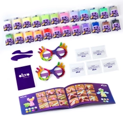 - 24× paquete de masa (10 g), guía ilustrada, herramientas de modelado, 5× bolsa con cierre, 2× gafas de papel