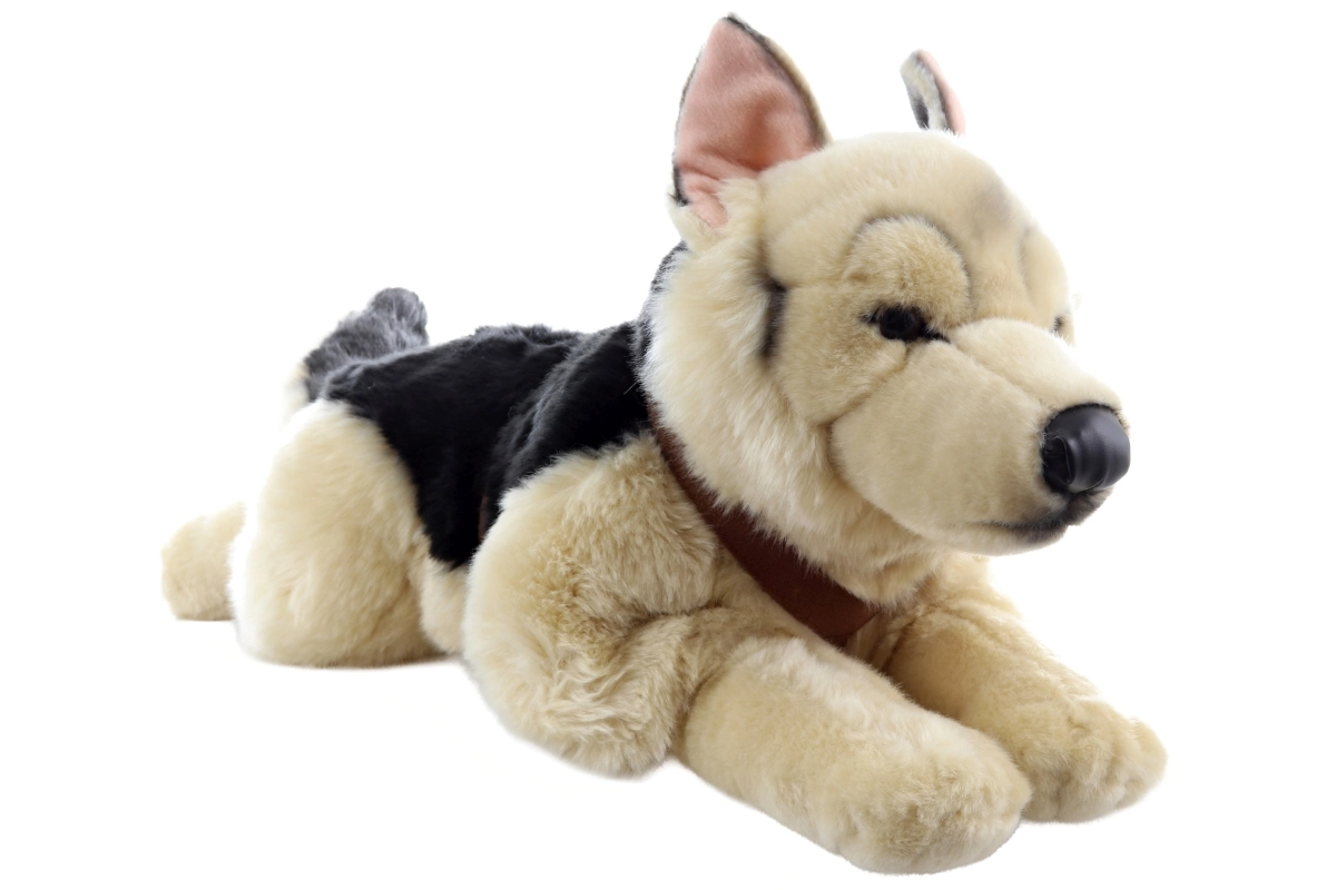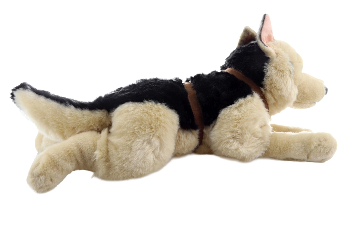 Este elegante pastor alemán de peluche con arnés es un gran compañero para el juego y los mimos del día a día. Su diseño realista con un denso pelaje beige y negro y orejas prominentes resulta muy fiel y fascinará a niños y adultos. Gracias a su superficie agradablemente suave, se sujeta de maravilla y aporta consuelo, además de ser un elemento decorativo para la habitación infantil.