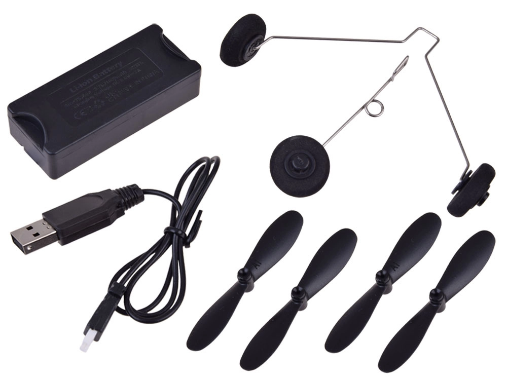 El paquete incluye hélices de repuesto, tren de aterrizaje, cable USB y emisora RC de 2,4 GHz. Solo hay que montar, cargar y volar.