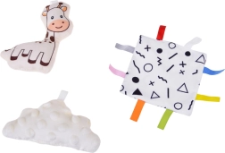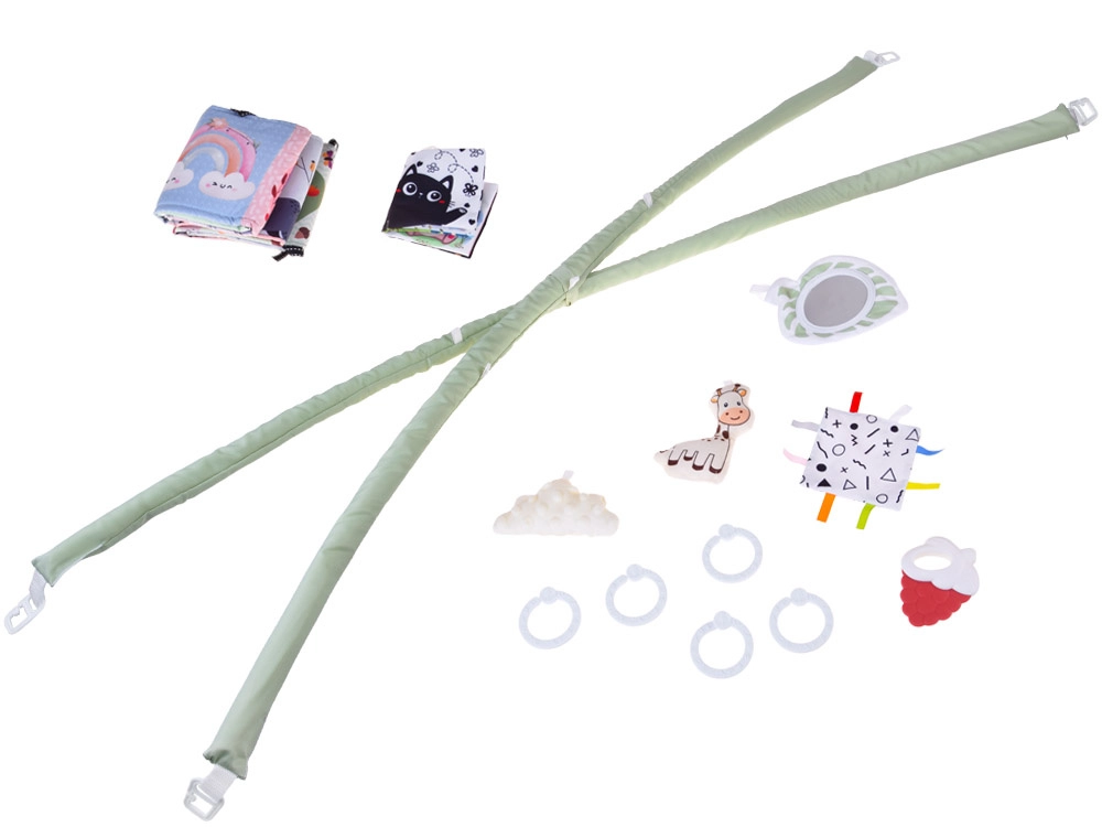 Incluye un completo conjunto de accesorios: jirafa de peluche, suave nubecita, mordedor, espejo seguro, cuadrado crujiente con etiquetas y libritos de tela de alto contraste. Gracias a ellos, la manta “crece” con el niño: desde la observación sobre la cabeza, pasando por el juego boca abajo, hasta los primeros giros y el sentarse.