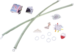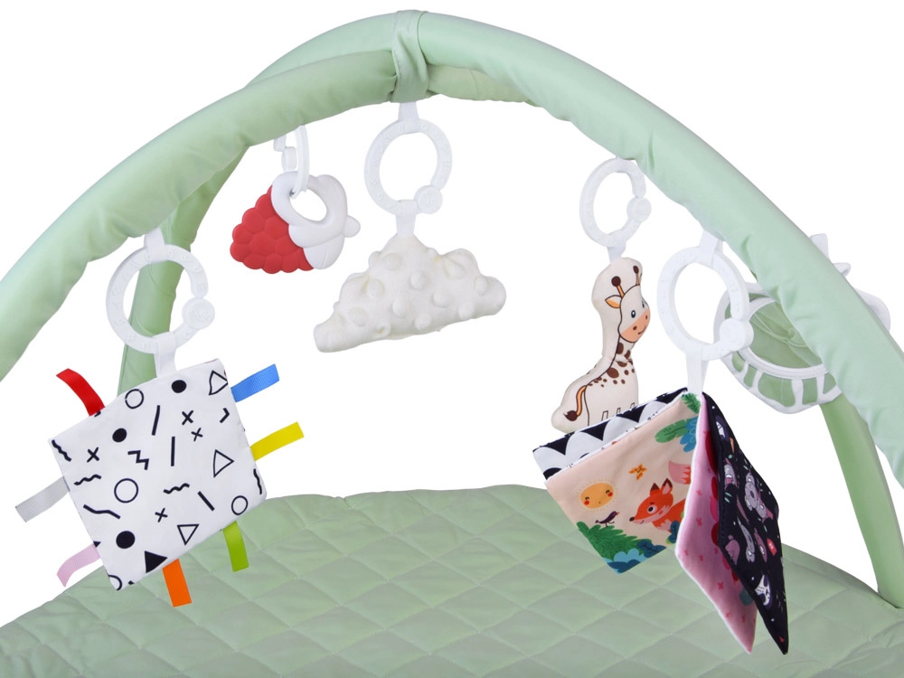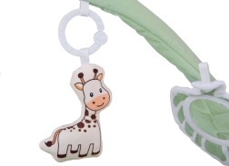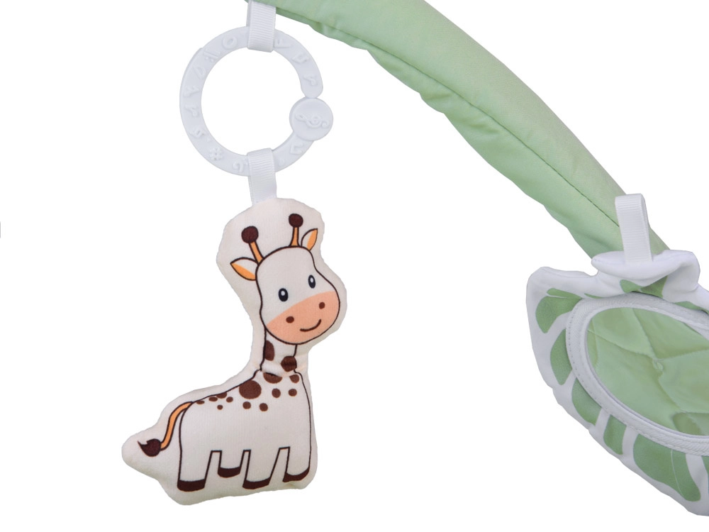 Dos arcos flexibles se pueden desabrochar fácilmente para el lavado o los viajes. Los juguetes colgantes —mordedor, nubecita, jirafa y cuadrados crujientes— motivan a estirarse y estimulan los sentidos.
