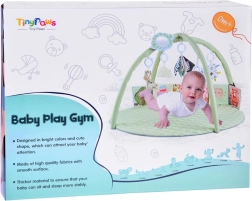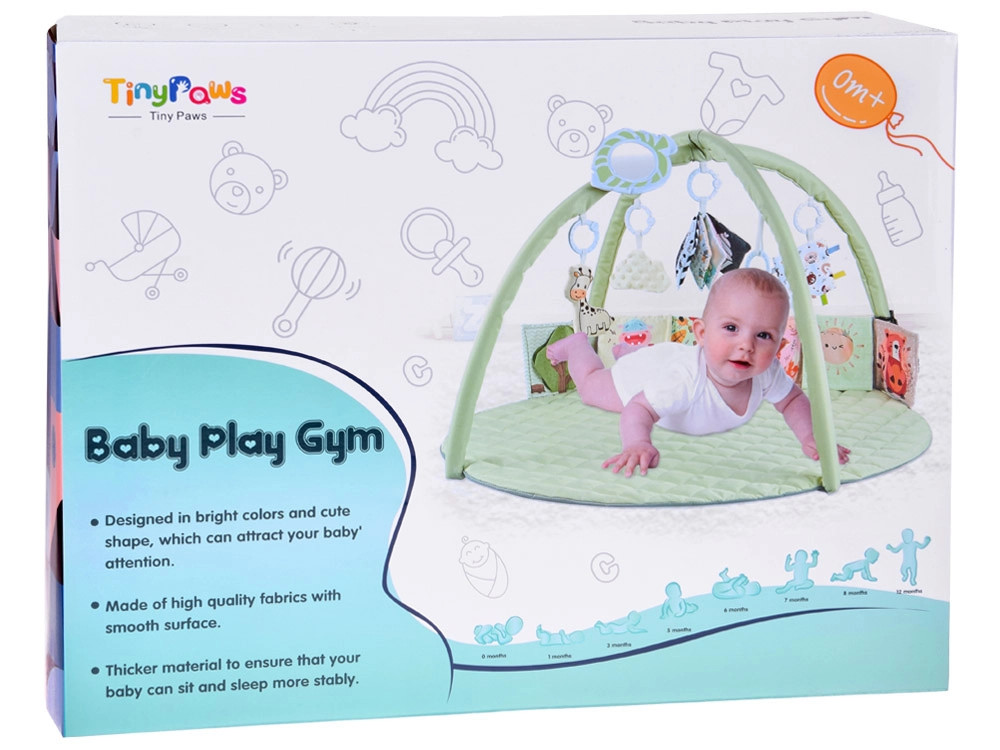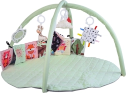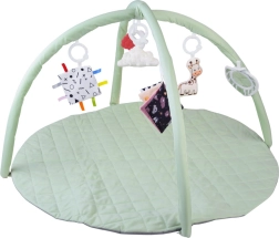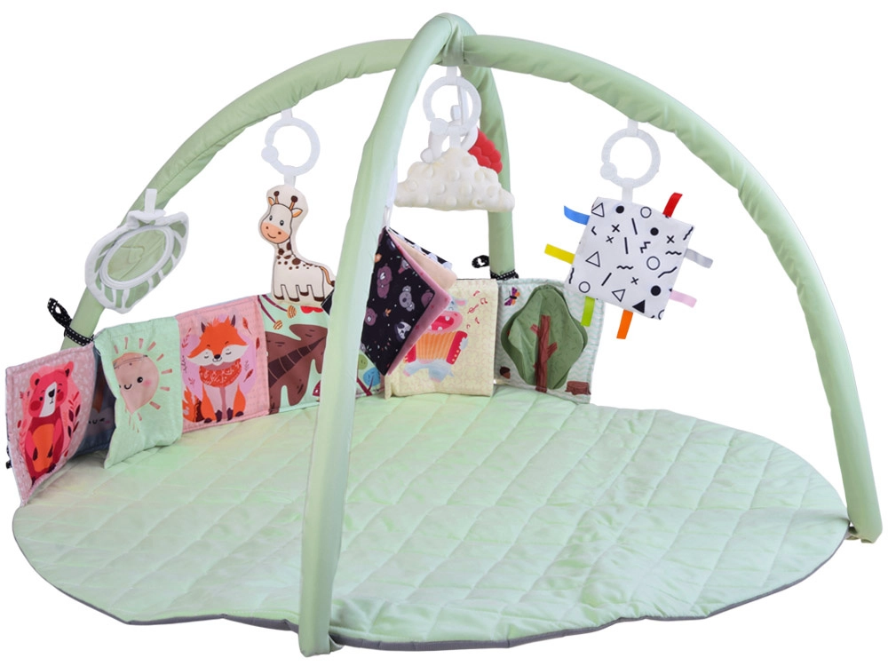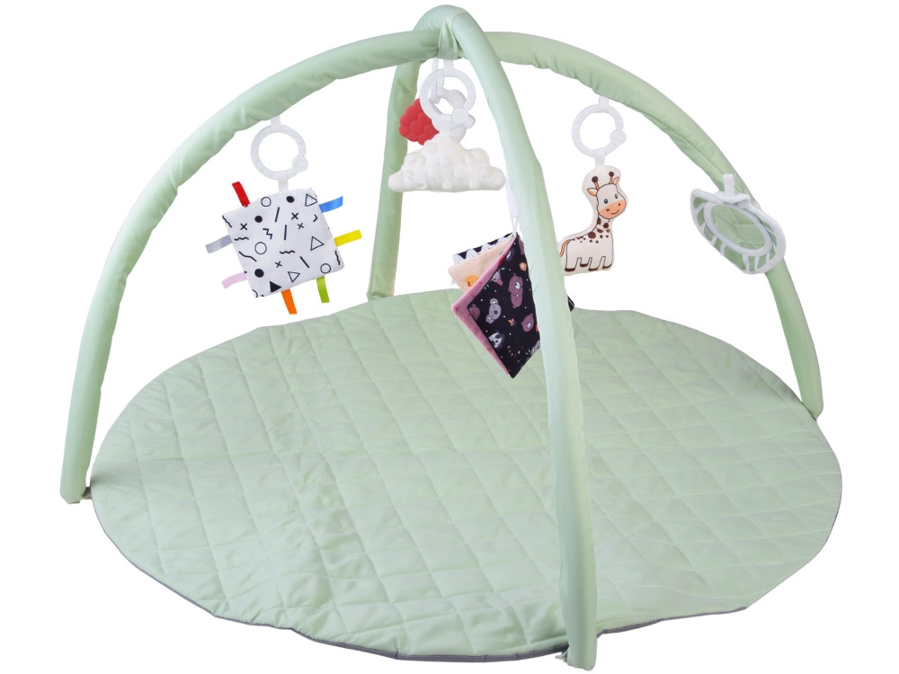 Esta manta de juego redonda, suavemente acolchada y en color menta pastel, crea un lugar seguro y cómodo para el descubrimiento diario. Dos arcos flexibles con sistema de fácil desmontaje permiten un mantenimiento rápido y un plegado compacto para viajar. Las texturas variadas, los elementos crujientes y los patrones de alto contraste desarrollan de forma natural la vista, el oído y el tacto, mientras que los juguetes colgantes motivan a estirarse, patear y girar.