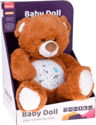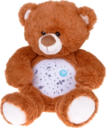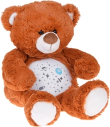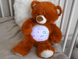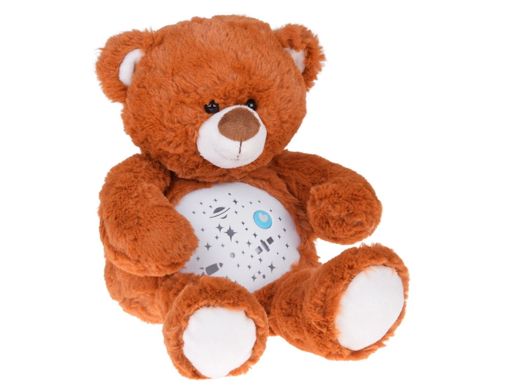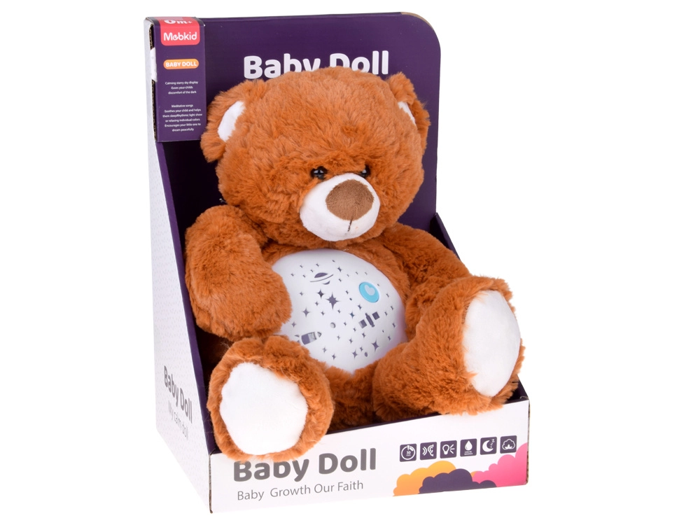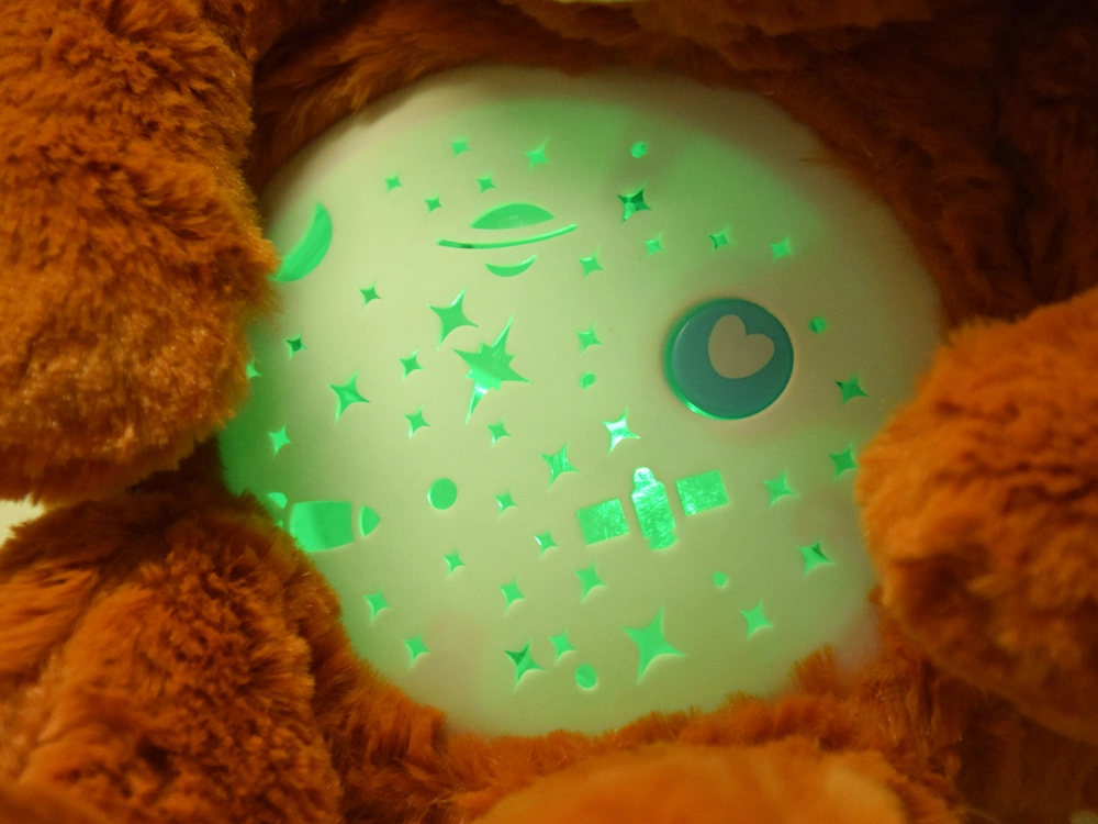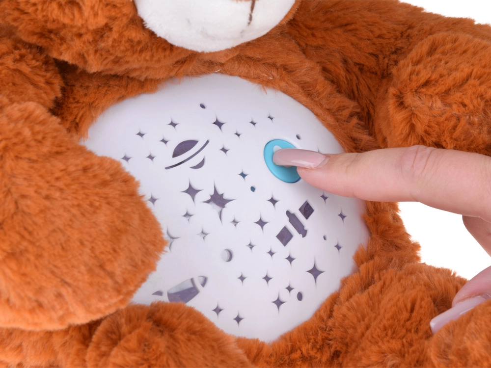 El osito de peluche con proyector de estrellas ayuda a los niños a dormirse más rápido y con mayor tranquilidad. Desde su barriguita se proyectan estrellitas, luna, planetas y cohetes, acompañados de melodías relajantes y una luz que cambia suavemente. Gracias al control de volumen de dos niveles podrás ajustar el sonido a los oídos sensibles del bebé.