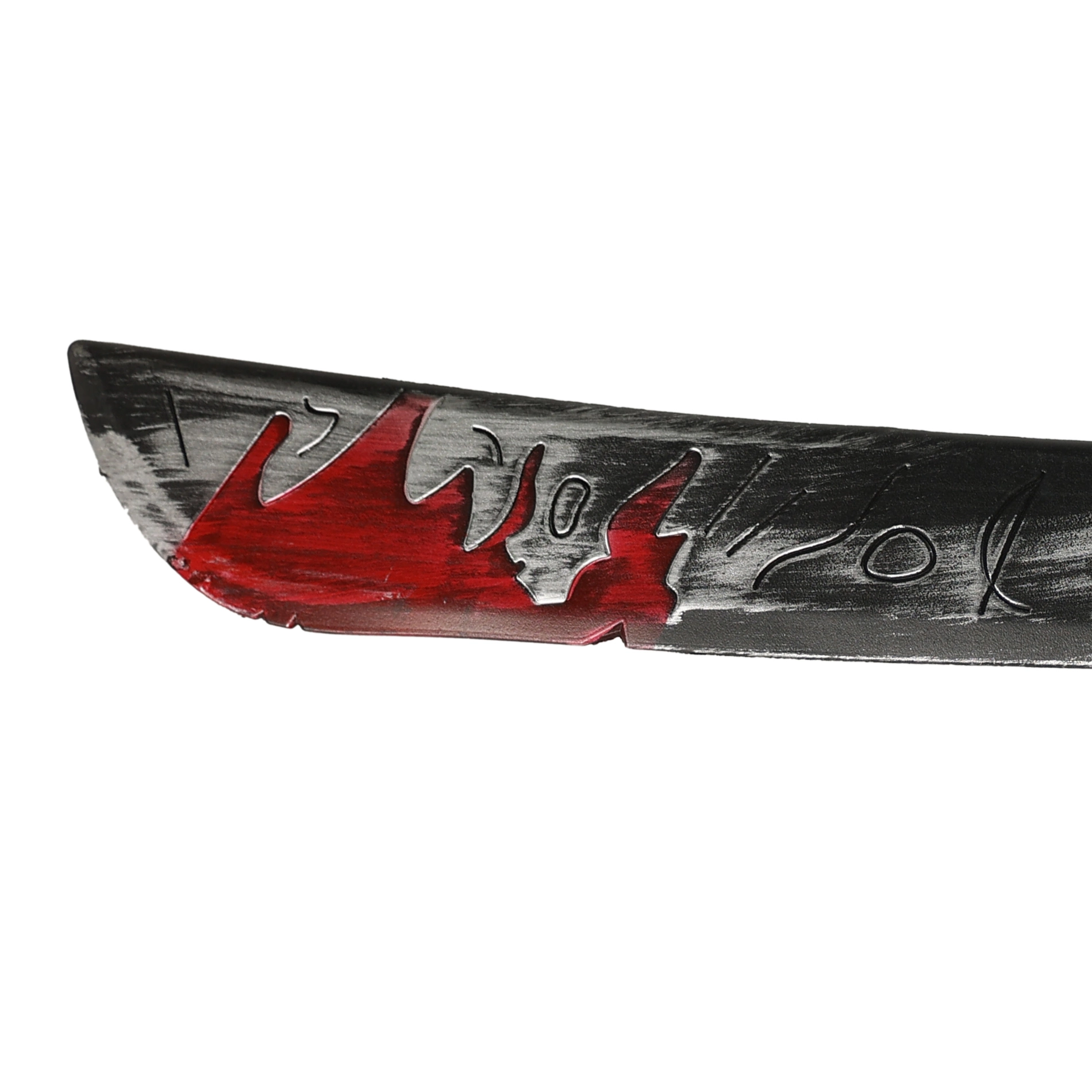- Apariencia realista: hoja gris “metálica” con efecto sangriento y grabados decorativos.