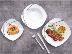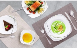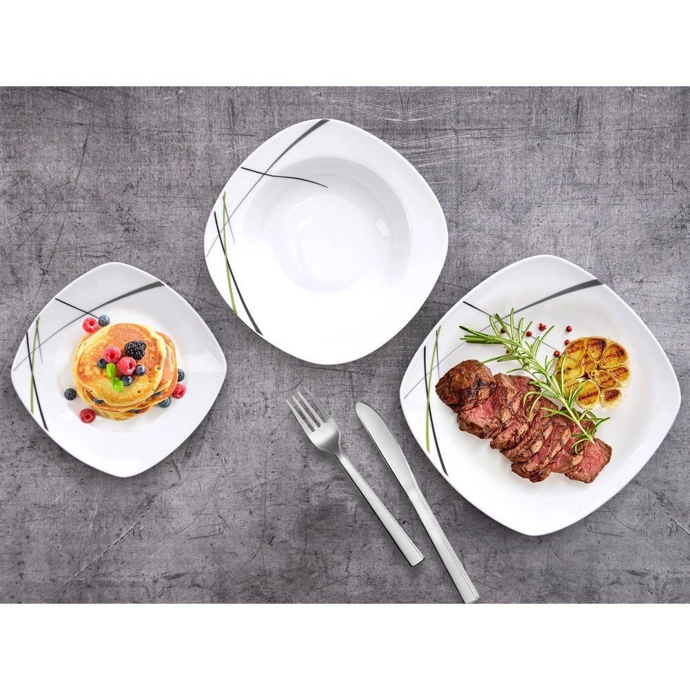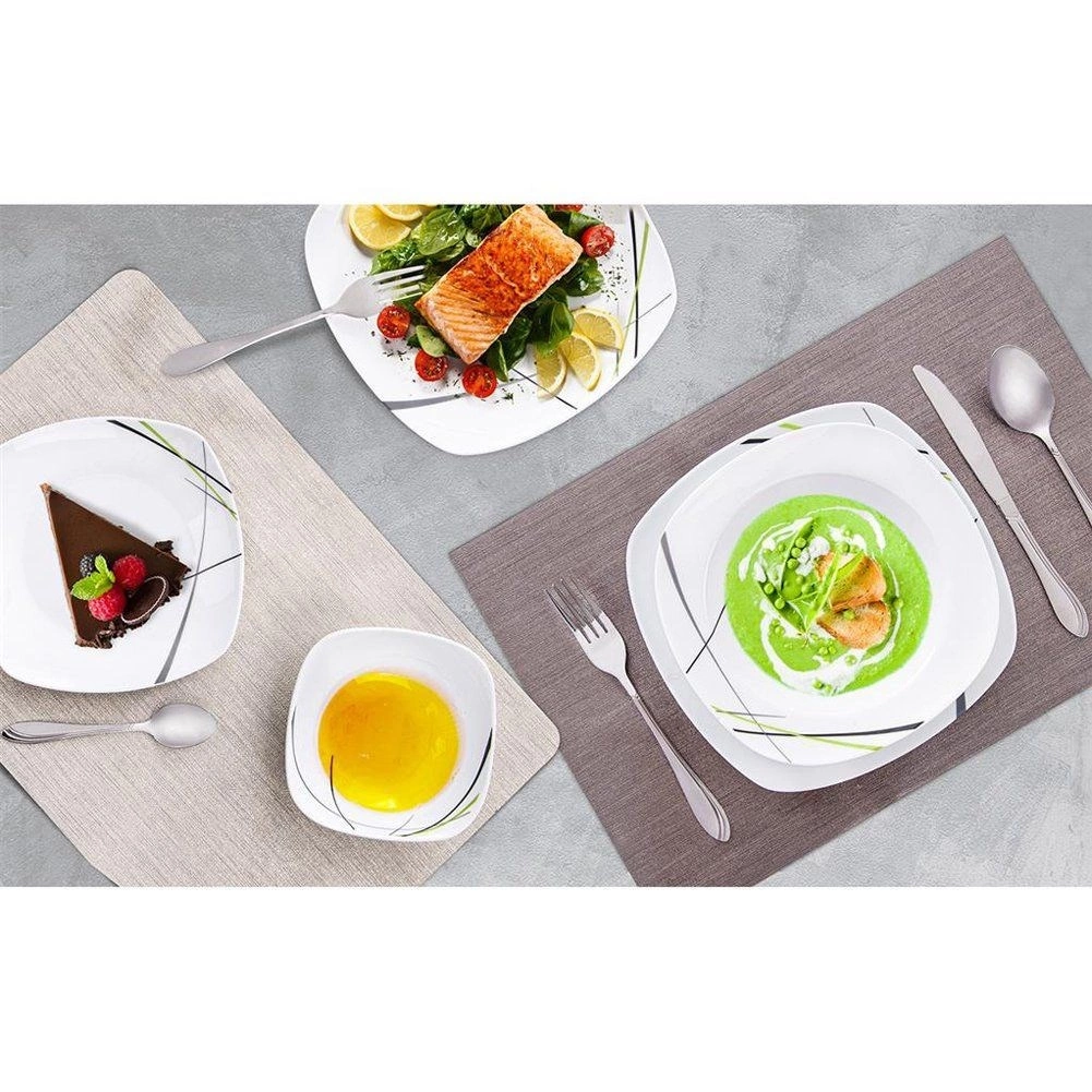 Este juego de vajilla cuadrada de porcelana de alta calidad aporta estilo y practicidad a cualquier hogar. El diseño moderno en combinación de colores verde, negro y gris luce magnífico en la mesa y se integra fácilmente con otros complementos. Es ideal para desayunos, almuerzos y cenas, y funciona de maravilla en reuniones familiares y celebraciones.