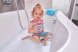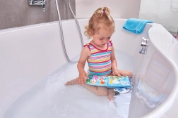 Su construcción ligera flota en el agua y es segura para jugar en la bañera y en la piscina. Los niños pasan las páginas fácilmente y descubren colores y formas.