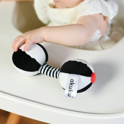 Este juguete de contraste con forma de mancuerna está fabricado en una agradable tela de peluche que es delicada con la sensible piel del bebé. Los elementos en blanco y negro llaman la atención del pequeño y favorecen la percepción visual desde los primeros días. En el interior hay suaves campanillas que suenan al moverlo y ayudan a desarrollar los estímulos auditivos.