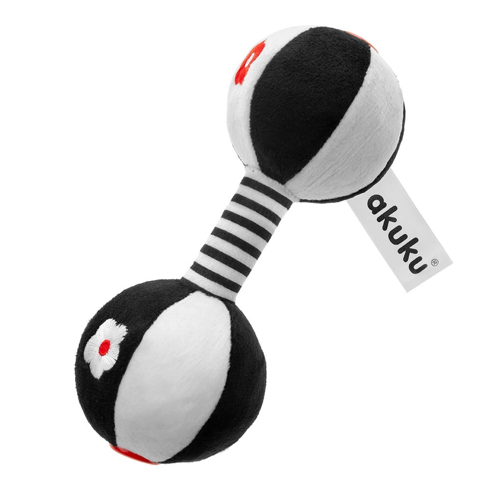 El suave juguete sensorial con forma de mancuerna de la marca Akuku encantará a los bebés desde el nacimiento. Gracias a sus colores de alto contraste estimula la visión, las campanillas integradas favorecen la audición y el suave felpudo desarrolla el tacto y la motricidad.
