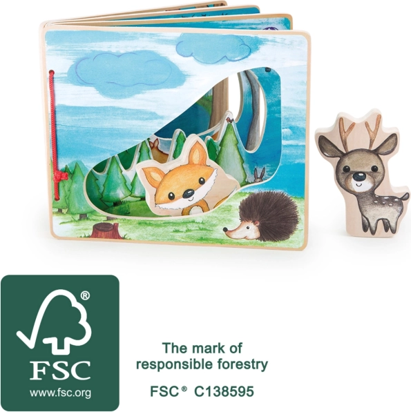 Adéntrate en el bosque profundo con este libro de madera interactivo que estimula la imaginación de los niños. Gracias a las figuras de zorro y ciervo, que ayudan a descubrir la flora y la fauna, cada juego se convierte en una experiencia única.