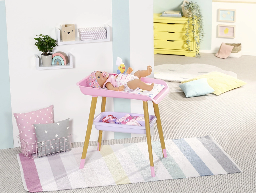 El elegante cambiador para muñecas BABY born ofrece a los niños un juego de cuidado realista. Tiene patas con acabado efecto madera, una suave colchoneta para cambiar, un dispensador de toallitas extraíble con un patito y prácticos compartimentos para pañales, ropita y accesorios. Completa a la perfección la habitación infantil y combina con otros accesorios de BABY born.