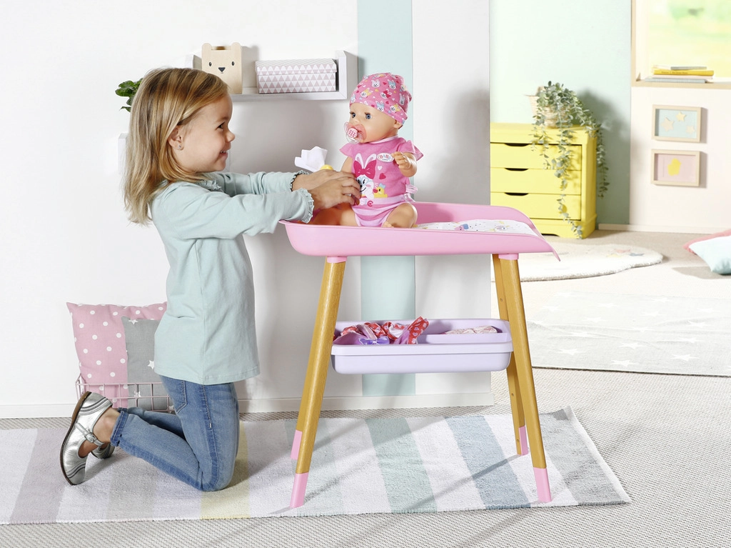 El cambiador para muñecas BABY born está diseñado en el popular estilo escandinavo: combina un aspecto limpio con practicidad. El acabado de madera de las patas aporta un toque moderno y estable, y la parte superior con una colchoneta suave es ideal para cambiar a las muñecas cómodamente.