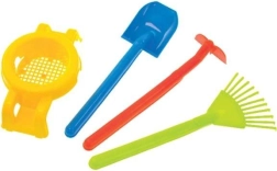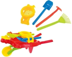 La gran rueda móvil garantiza un desplazamiento fluido y estable sobre distintas superficies, mientras que los dos apoyos permiten dejar la carretilla con seguridad. Las empuñaduras ergonómicas están adaptadas a las manos infantiles y favorecen un agarre firme. El paquete incluye prácticos accesorios: rastrillo, pala, azadilla y tamiz, ideales para transportar tierra, recoger hojas o tamizar arena.