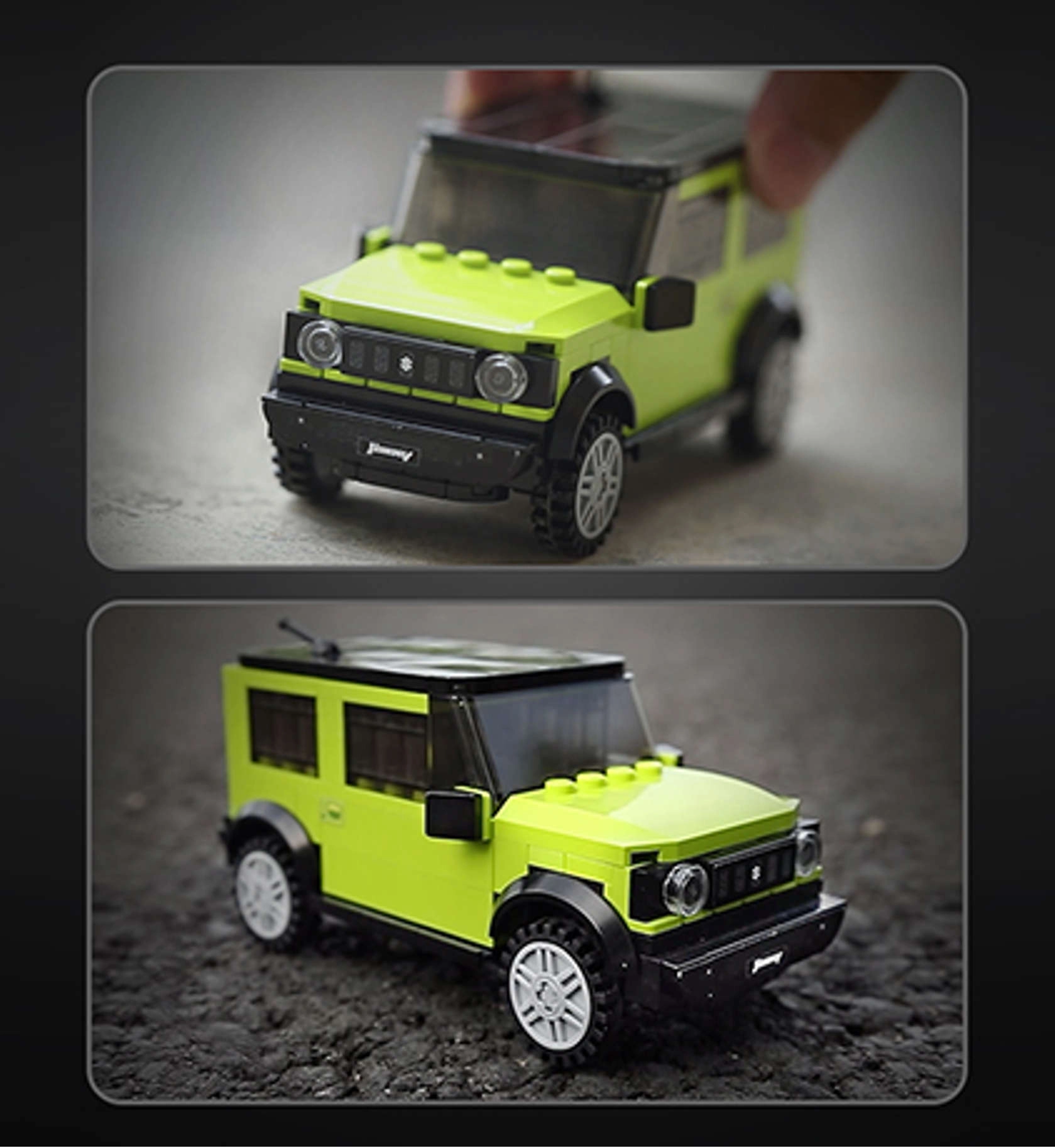 Descubre el modelo con licencia SUZUKI Jimny de CaDA, que destaca por sus detalles realistas y su aspecto robusto. La carrocería verde con acentos negros, el frontal fielmente reproducido y las grandes ruedas todoterreno aportan al set un auténtico carácter off-road. El modelo terminado se mueve libremente sobre sus ruedas y luce genial en la estantería.