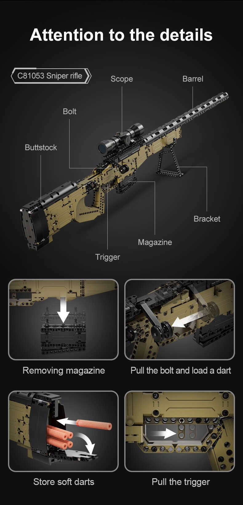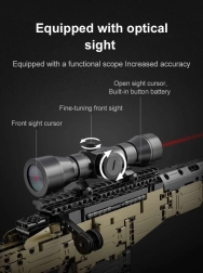 Este set detallado de la marca DOUBLE EAGLE/CADA trae un proyecto atractivo para niños mayores y adolescentes. Montarás un impresionante modelo de rifle de francotirador SNIPER RIFLE con muchas partes móviles, incluido el cargador y la mira óptica. Gracias a la correa incluida, el modelo es fácil de transportar.