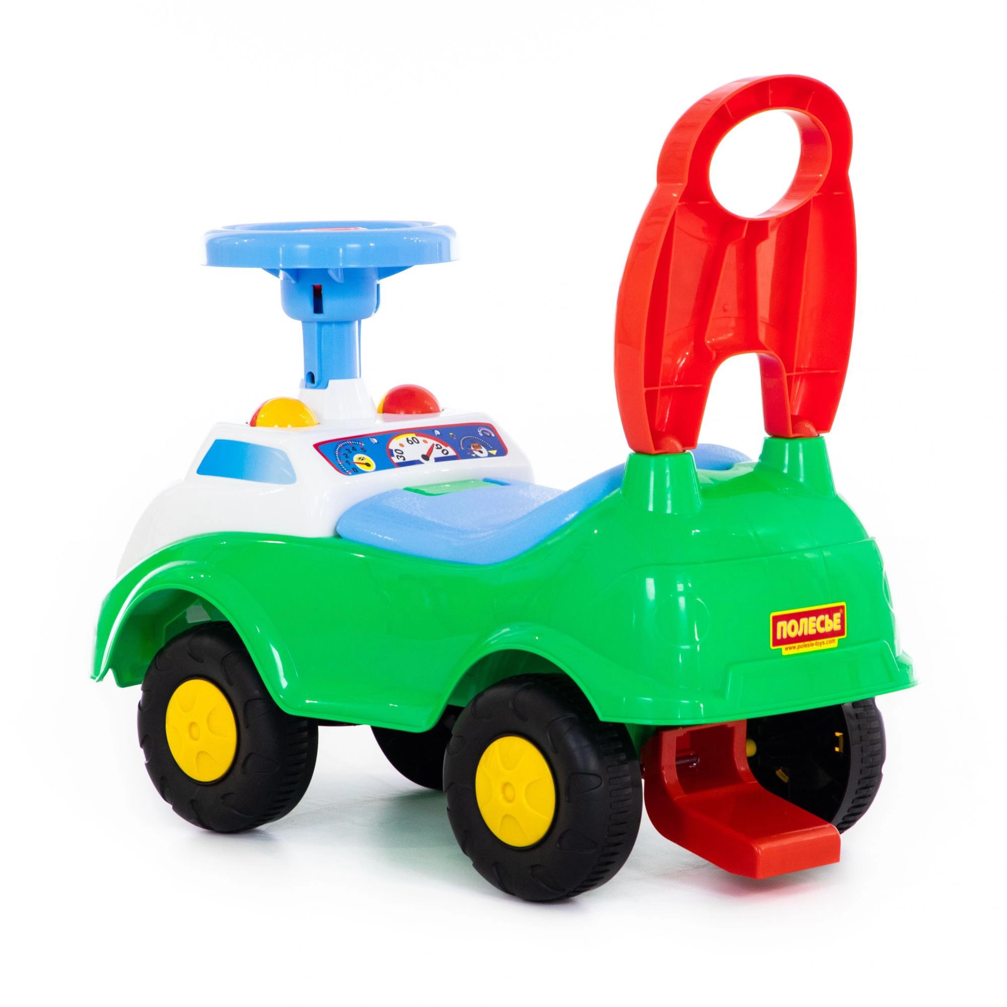 Elegante correpasillos en colores vibrantes para pequeños pilotos que ofrece conducción segura, asiento cómodo a 22 cm de altura y respaldo para mayor estabilidad. A los niños les encantará el módulo de sonido en el volante y la posibilidad de apoyar sus primeros pasos gracias al sólido asa trasera. La carga máxima es de 50 kg y sus dimensiones compactas facilitan su uso en casa y al aire libre.