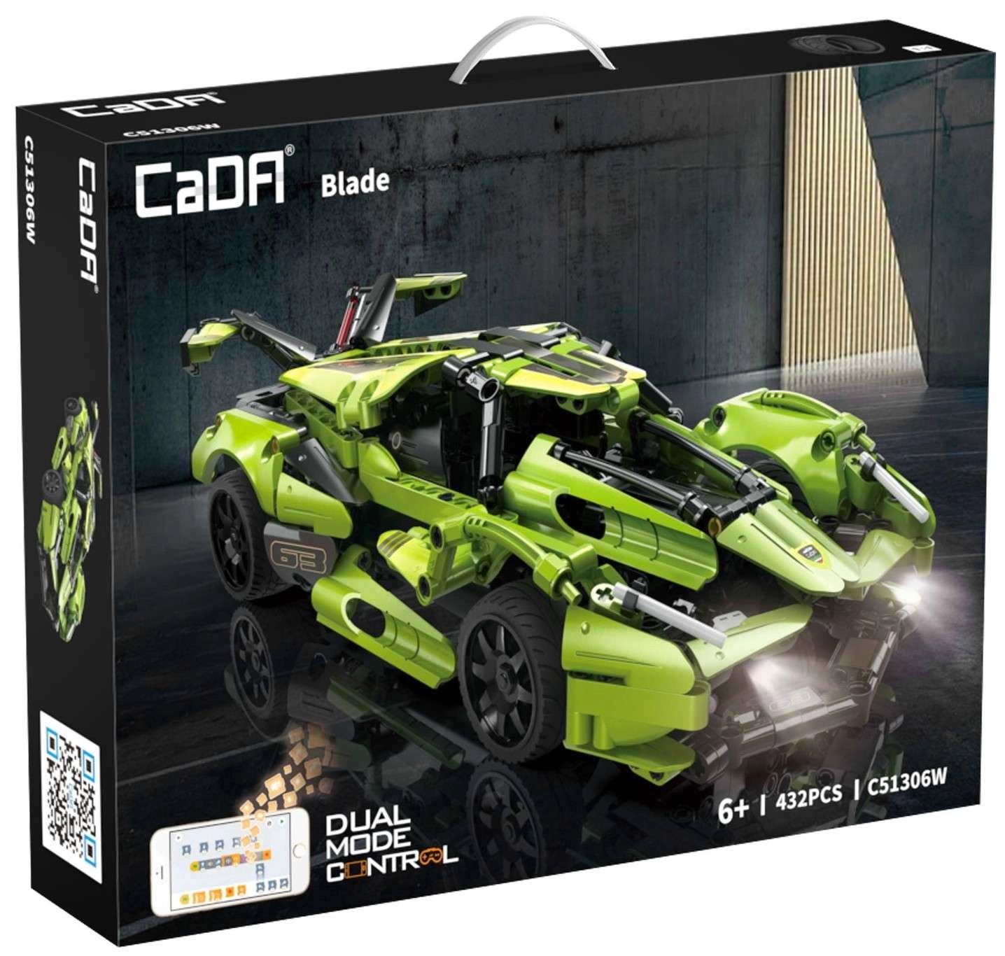 Construye tu propio coche deportivo Blade verde de la marca CaDA y contrólalo a distancia con un mando RC de 2,4 GHz o con la app Bluetooth. El set incluye 432 piezas, luces LED delanteras y traseras funcionales, ruedas de goma para circular sobre distintas superficies y un alcance de control de más de 25 metros. Velocidad máxima de hasta 5,5 km/h y un embalaje elegante que hacen de este set un regalo ideal para constructores pequeños y grandes.