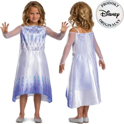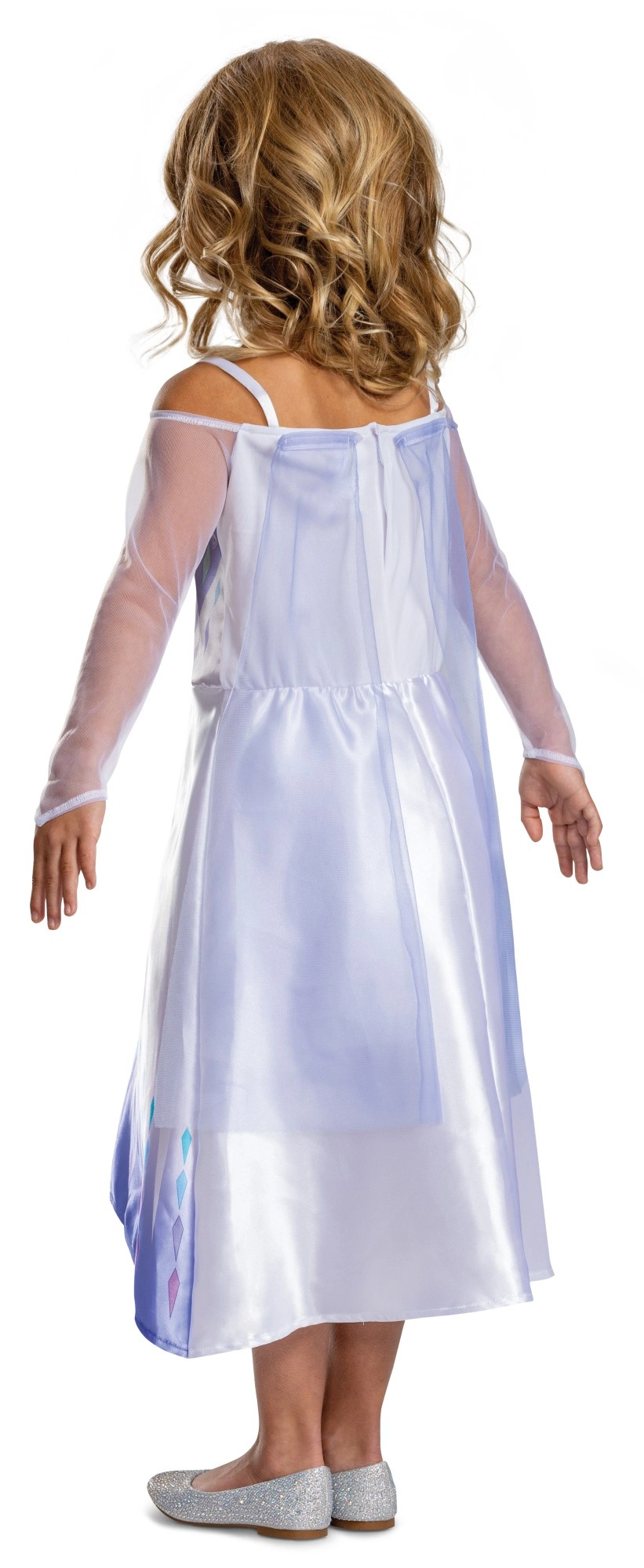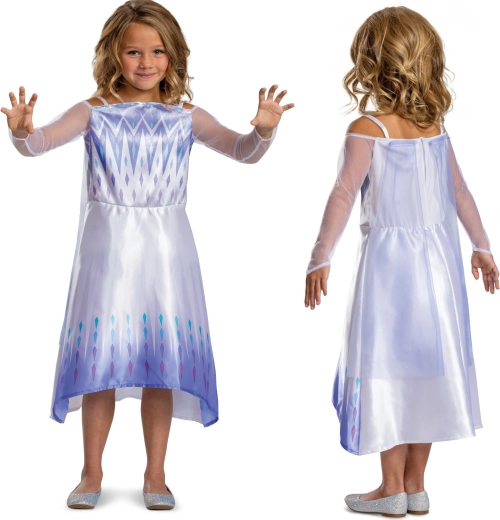 Convierte el juego cotidiano en un reino helado con el disfraz inspirado en la heroína ELSA de la película DISNEY FROZEN. El vestido, en delicados tonos blanco, lila y plateado, presenta mangas translúcidas, un corpiño estampado con motivos “helados” y una falda fluida con degradado de color y pequeños patrones de diamantes.