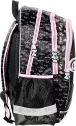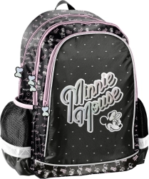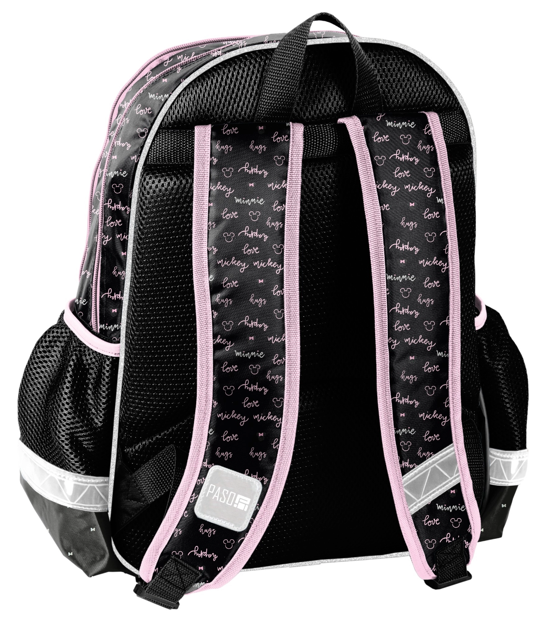 Elegante mochila escolar en negro‑rosa con el motivo de MINNIE MOUSE de la marca Paso, que ofrece estructura ligera, espalda reforzada y perfilada, tirantes ergonómicos acolchados y elementos reflectantes para mayor seguridad. Dos compartimentos principales, un bolsillo frontal y bolsillos laterales de malla garantizan un almacenamiento ordenado del material escolar.