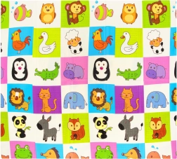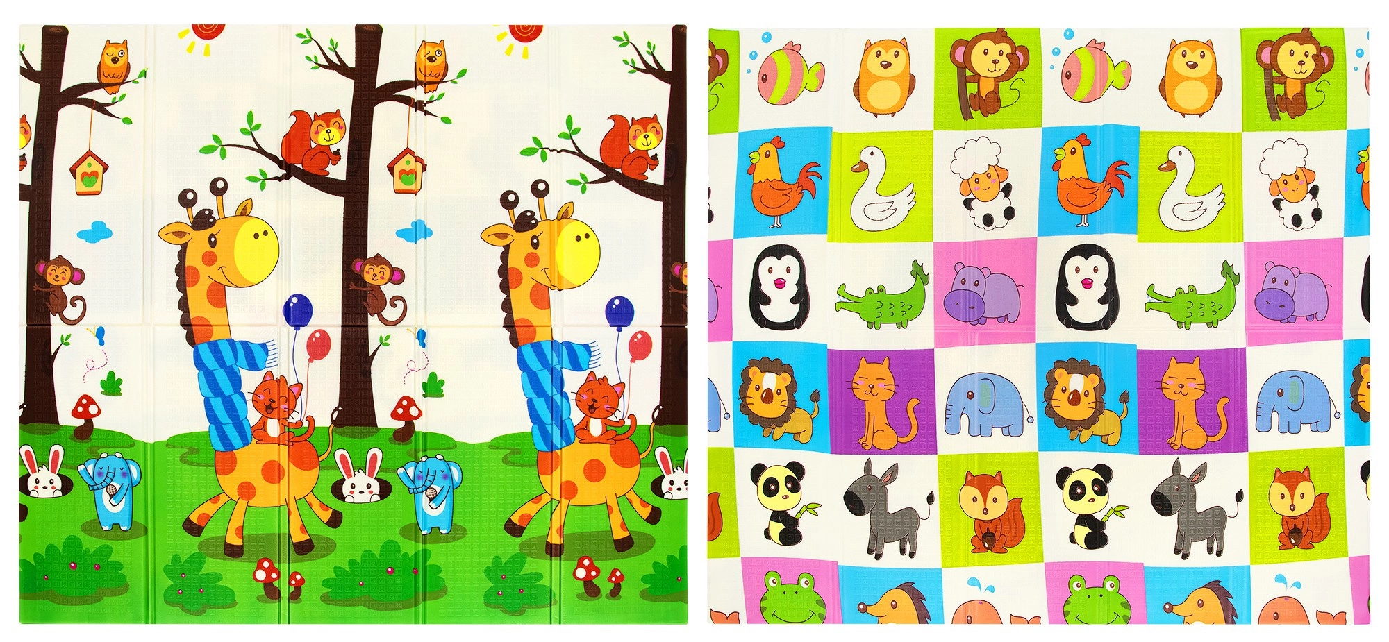 En un lado, adorables jirafas; en el otro, un colorido mosaico de animalitos. Estimula la percepción visual y aporta un toque lúdico al interior.