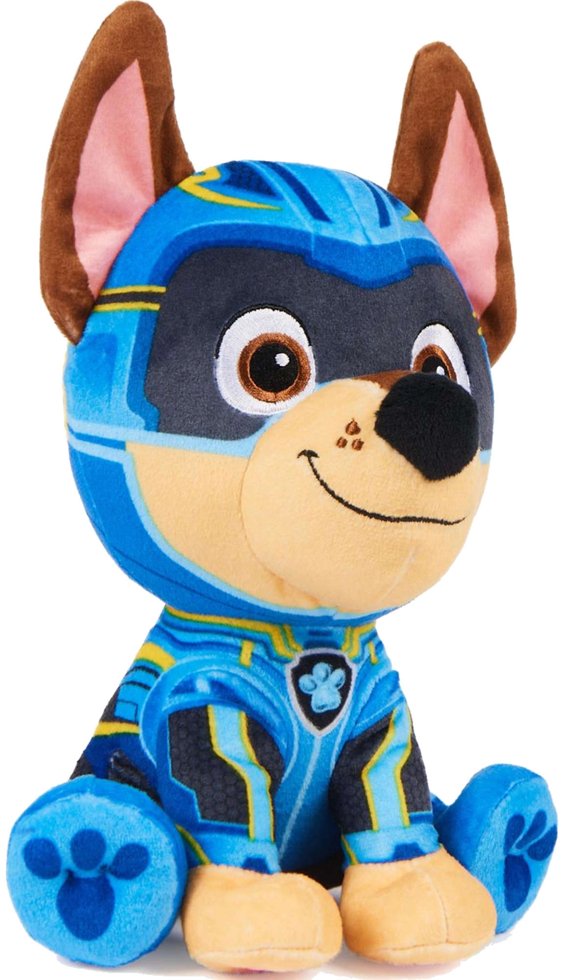 Chase tiene ojos y patas bordados, materiales en contraste y un traje de superhéroe azul y amarillo conocido de la película Mighty Movie.