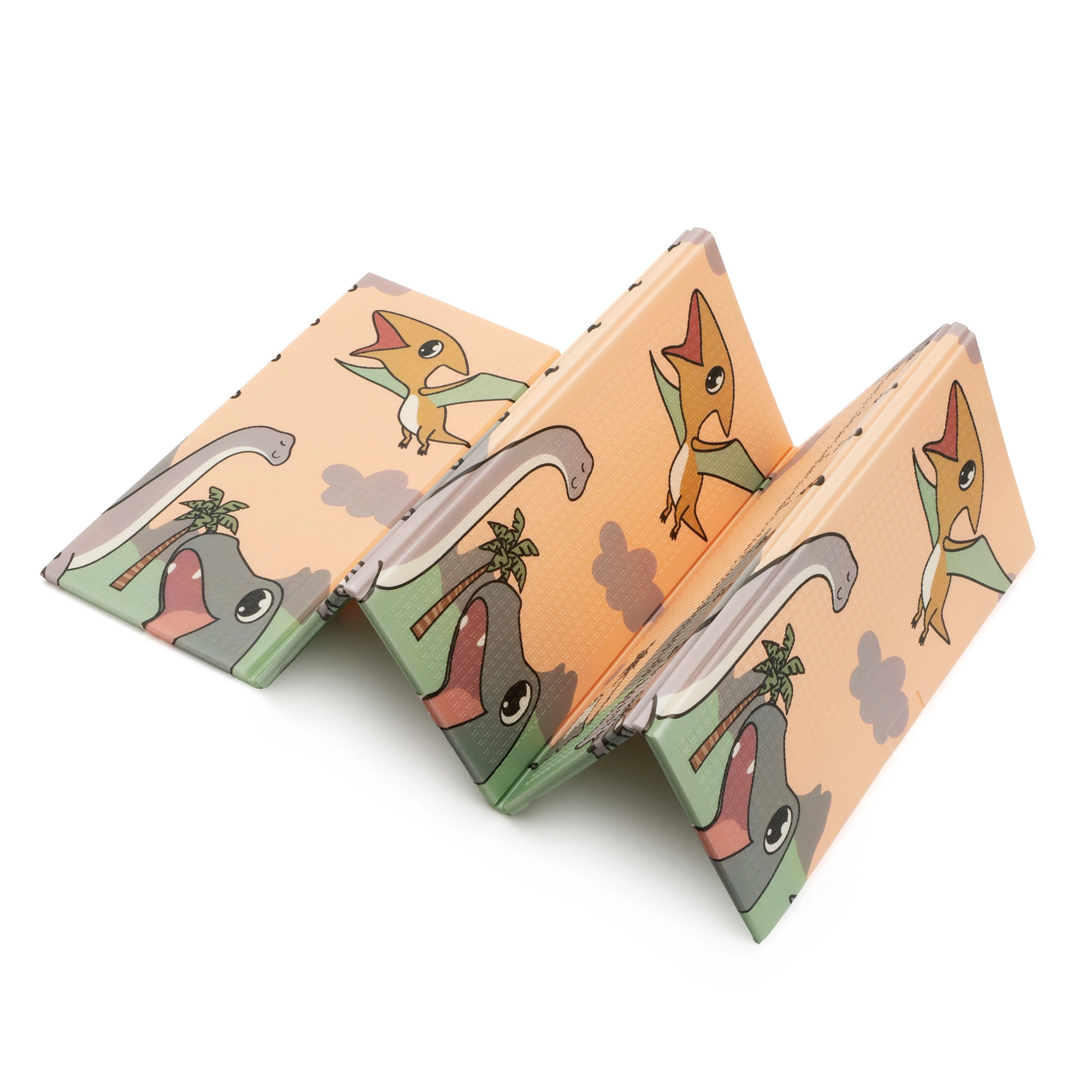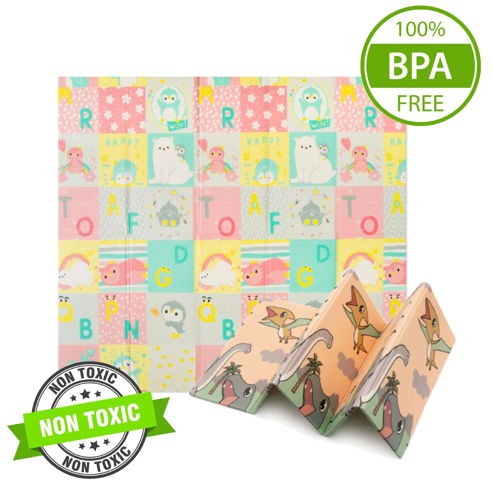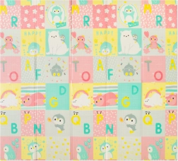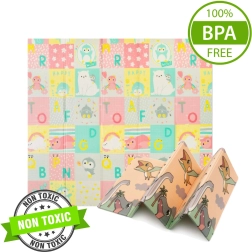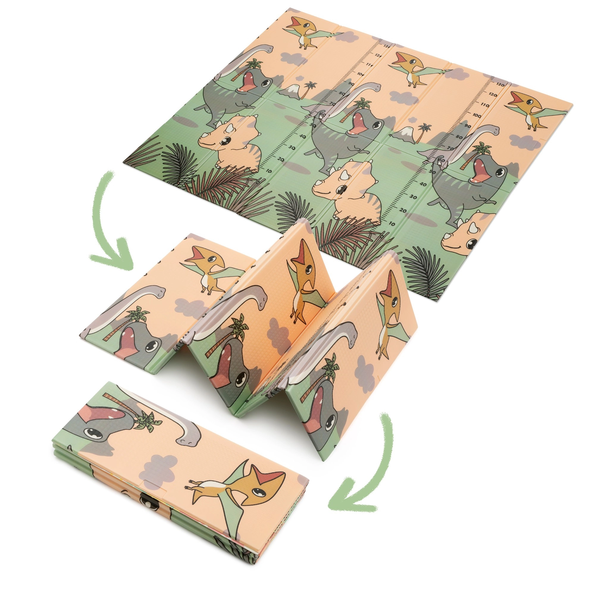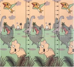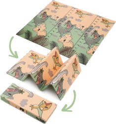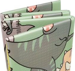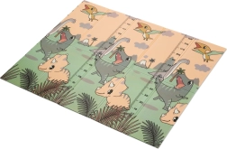 Ambas caras presentan un estampado educativo en suaves colores pastel: adorables dinosaurios con medidor de altura y un motivo de animales y letras. El relieve antideslizante favorece el aprendizaje seguro del gateo y la marcha y, al mismo tiempo, estimula el desarrollo sensorial. La superficie es impermeable y basta con pasar un paño húmedo.