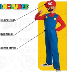 Descubre el disfraz infantil original de Super Mario de la marca Disguise, un producto con licencia del popular juego SUPER MARIO. Ideal para carnaval, fiestas de disfraces y juegos en casa. Incluye un mono rojo y azul con botones amarillos, gorra y bigote. Talla para niños de 10–12 años, altura 137–149 cm. Material 100% poliéster para un cuidado sencillo y un uso cómodo.