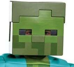 Las formas cúbicas de los hombros y la máscara en forma de bloque convierten al niño en un legendario zombi de Minecraft en un instante.