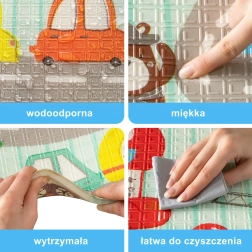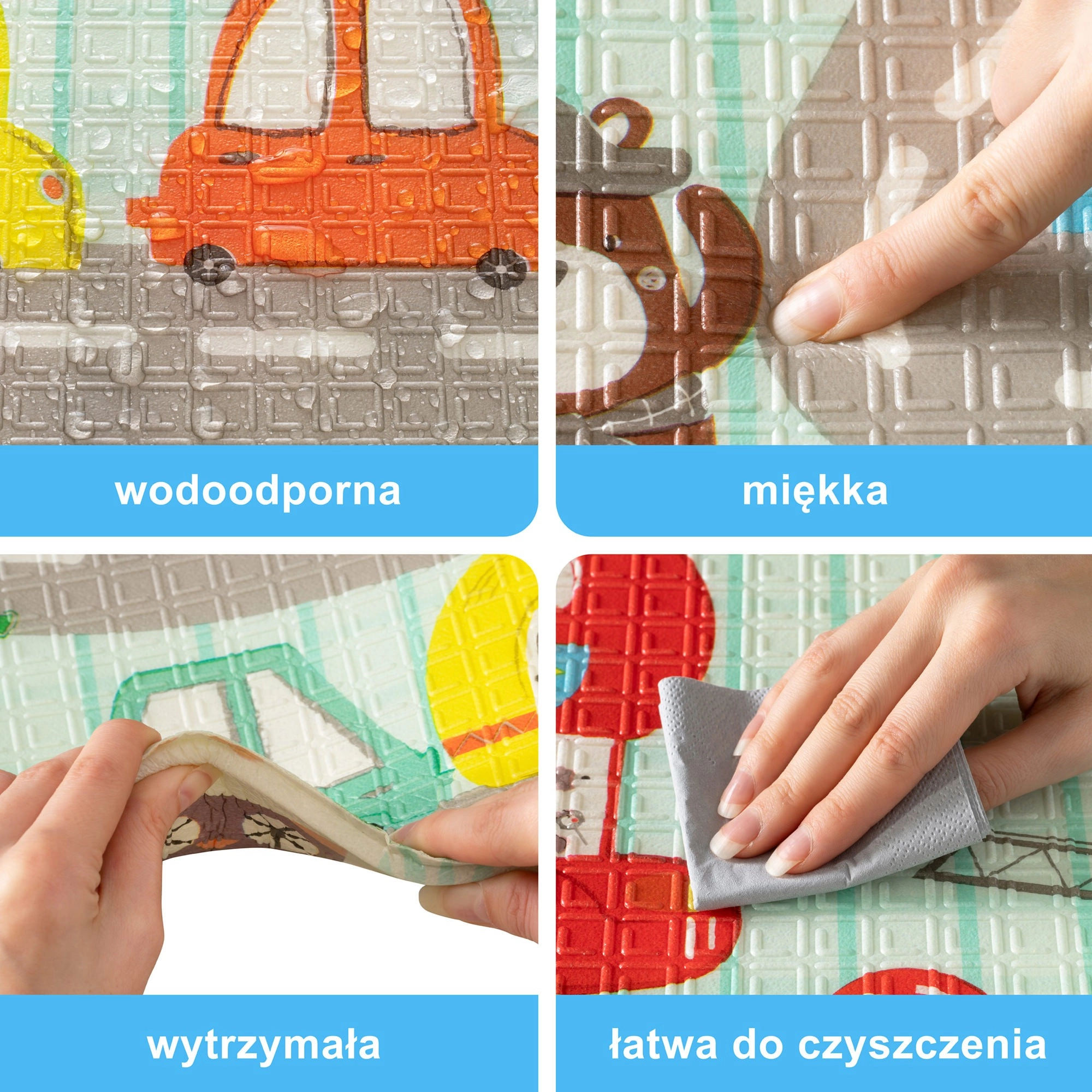 La práctica esterilla infantil reversible HUMBI de espuma XPE de alta calidad con dimensiones 120 × 180 × 0,8 cm ofrece una superficie suave, segura y impermeable para jugar, gatear y dar los primeros pasos. Es ligera, plegable rápidamente, fácil de limpiar y en el paquete incluye una bolsa de transporte. Un lado presenta el motivo de animalitos del bosque y el otro calles coloridas y ciudad para fomentar la imaginación.