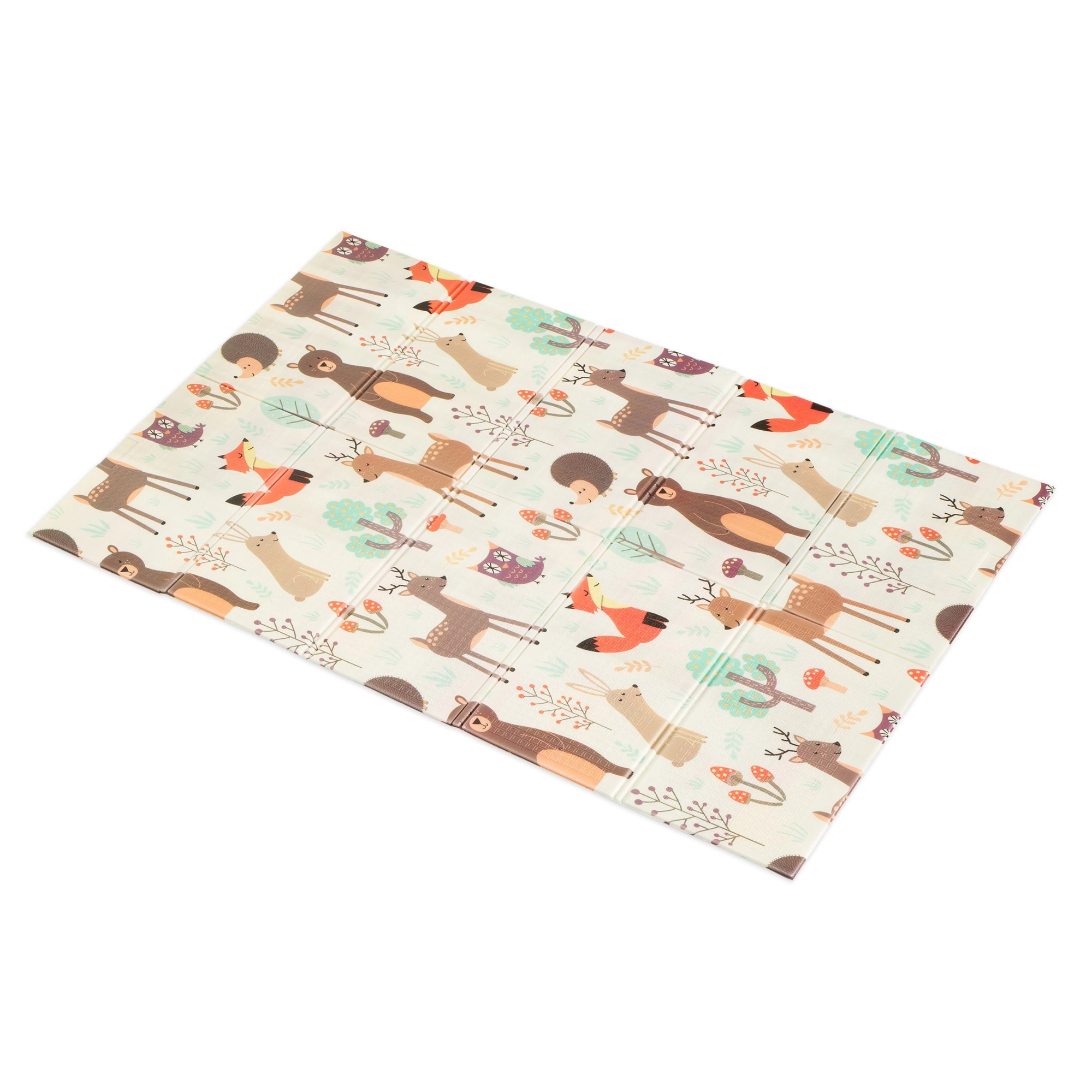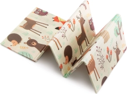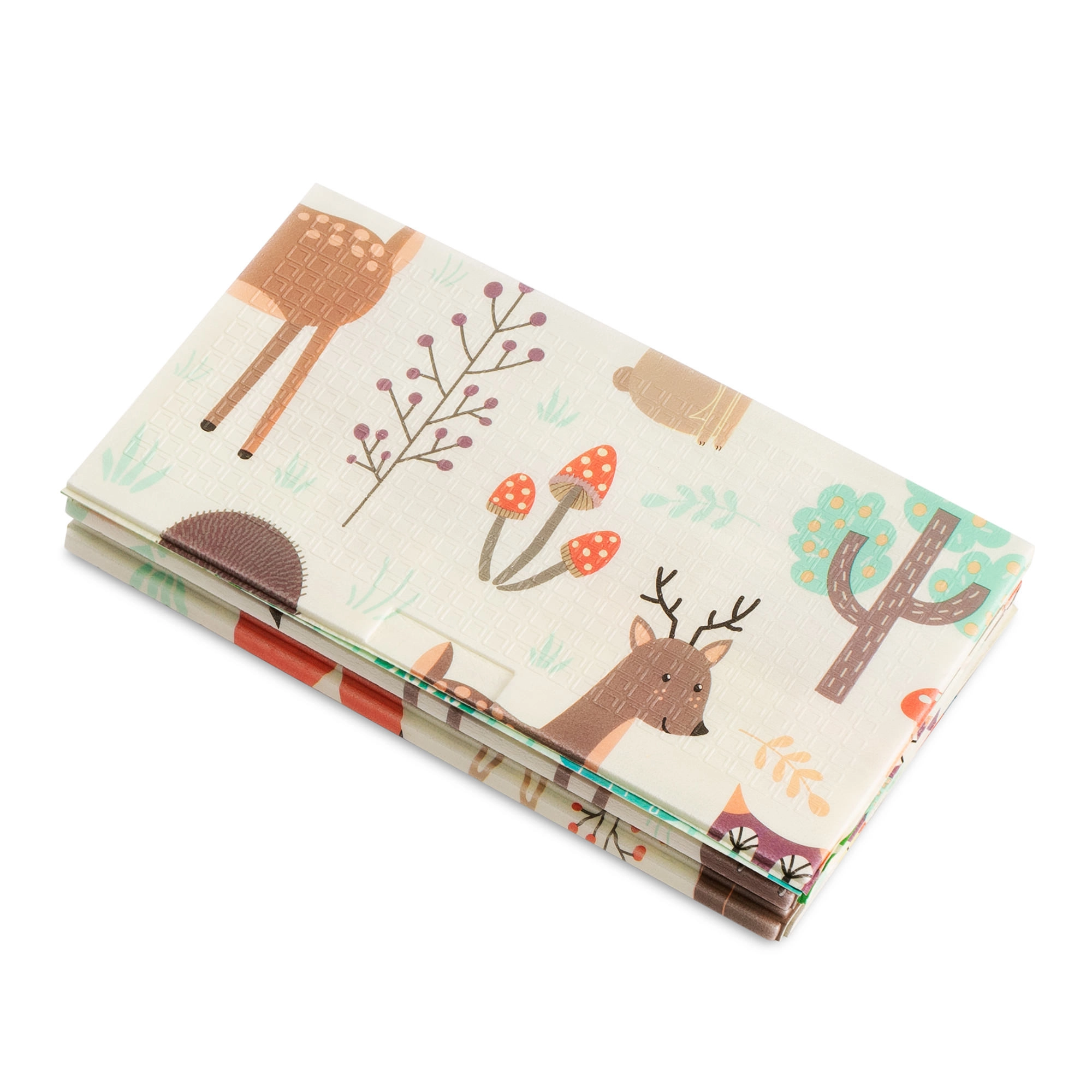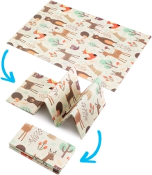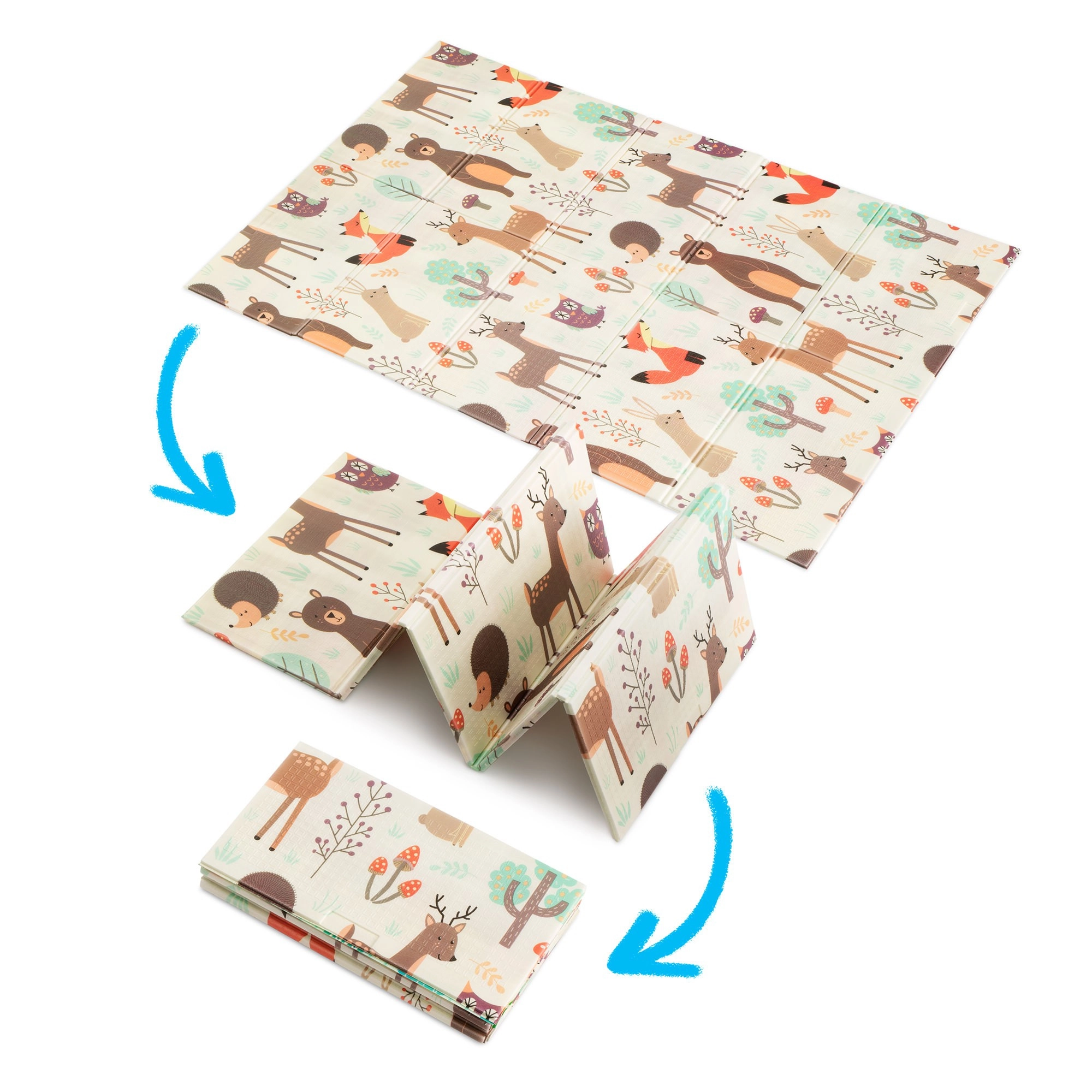 La esterilla es reversible: por un lado un adorable motivo forestal y por el otro carreteras y edificios para un juego imaginativo. Gracias a su diseño plegable, se despliega o pliega en segundos y se guarda en la bolsa con cremallera y asas. Adecuada para el dormitorio infantil, el salón e incluso el jardín o un picnic.
