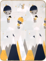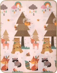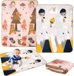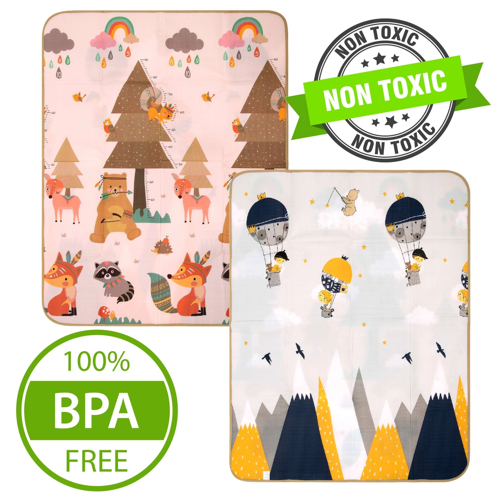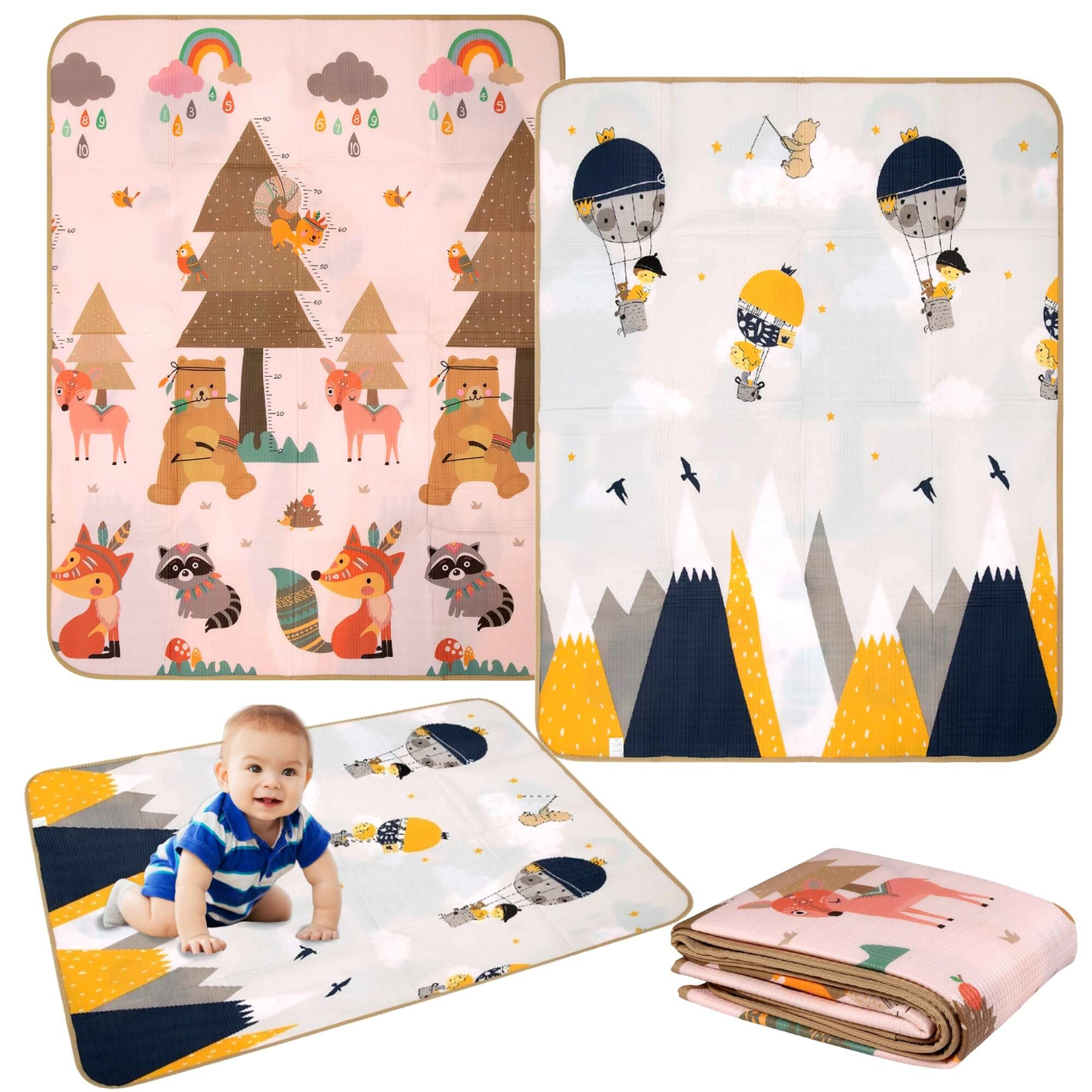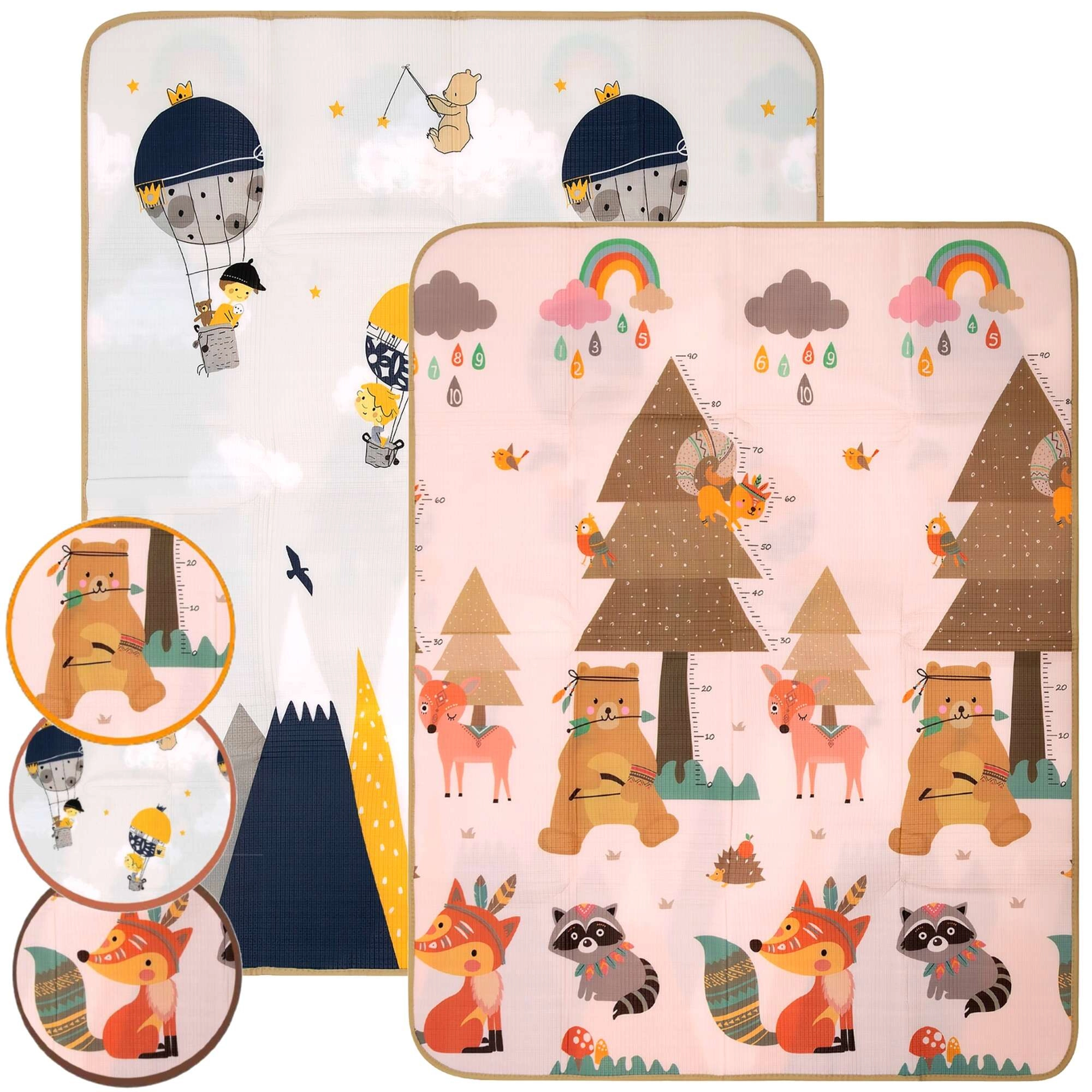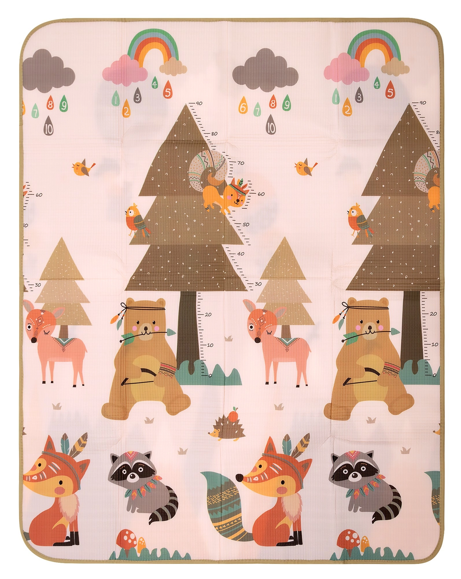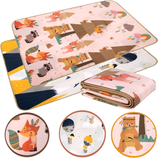 Cada lado ofrece una gráfica educativa diferente: animales del bosque, números, regla de crecimiento y un motivo de montañas con globos. Los niños se sentirán atraídos por colores vivos pero agradables que fomentan la percepción visual.