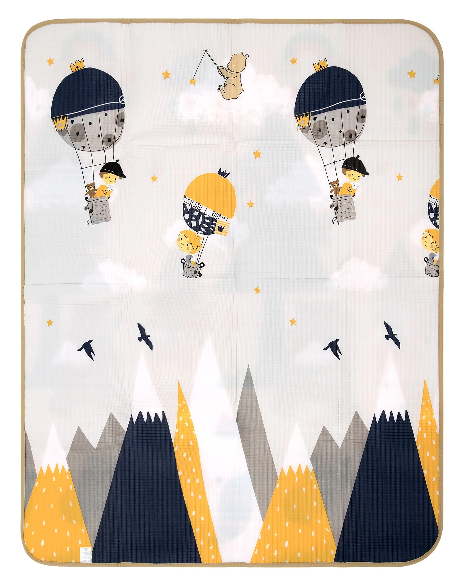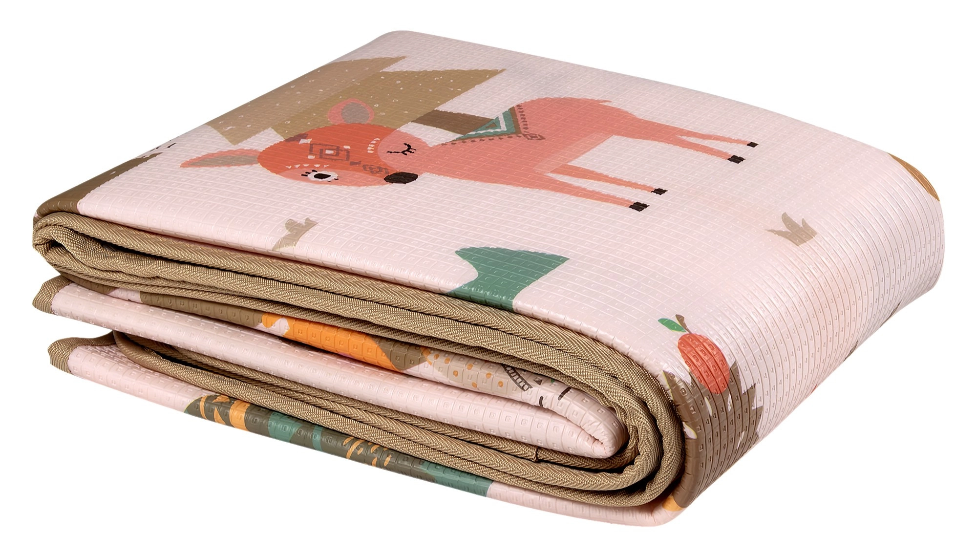 La alfombra se pliega rápidamente en un formato compacto y cabe bajo la cuna o entre los muebles. Incluye una bolsa con cremallera y asas para un transporte limpio y cómodo.