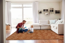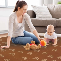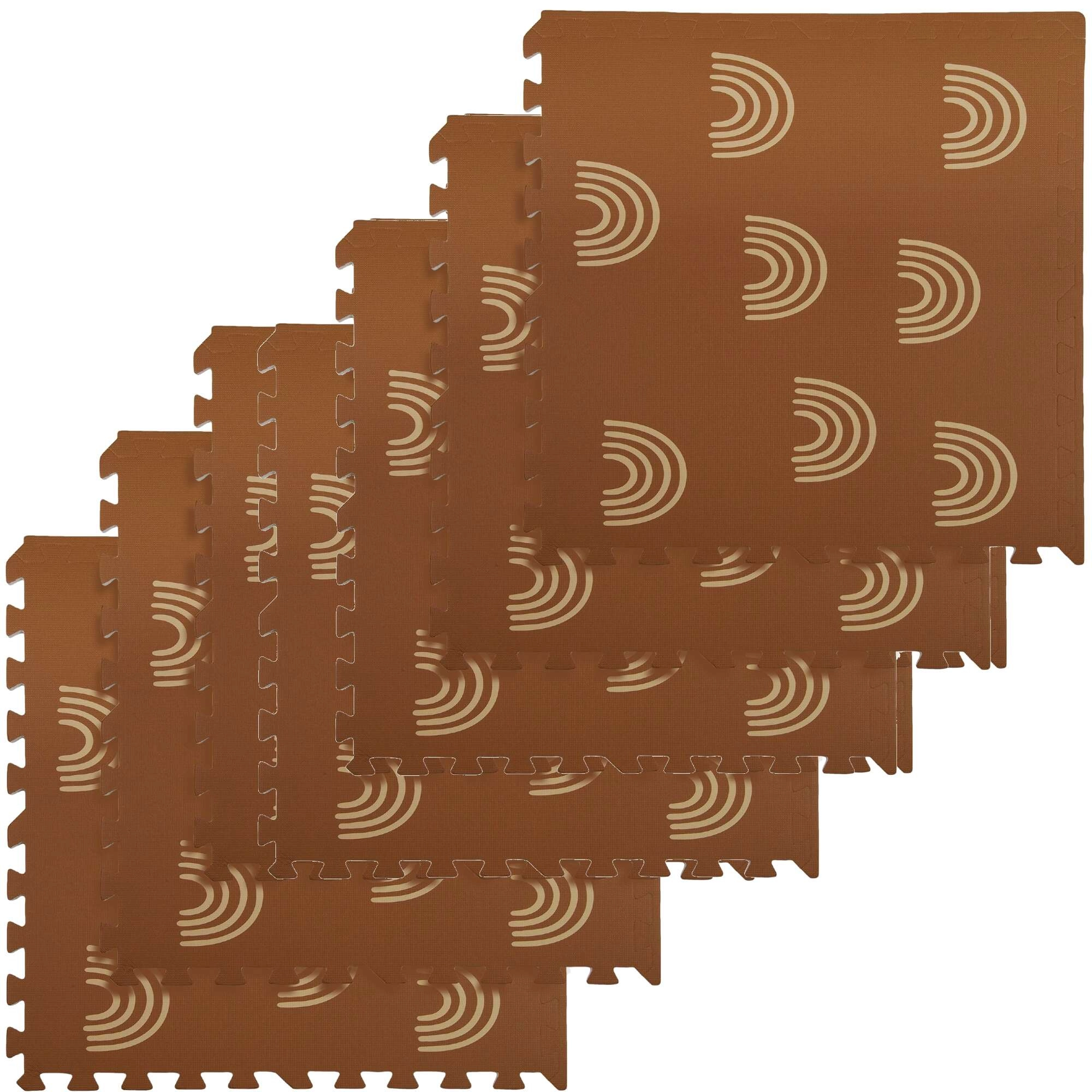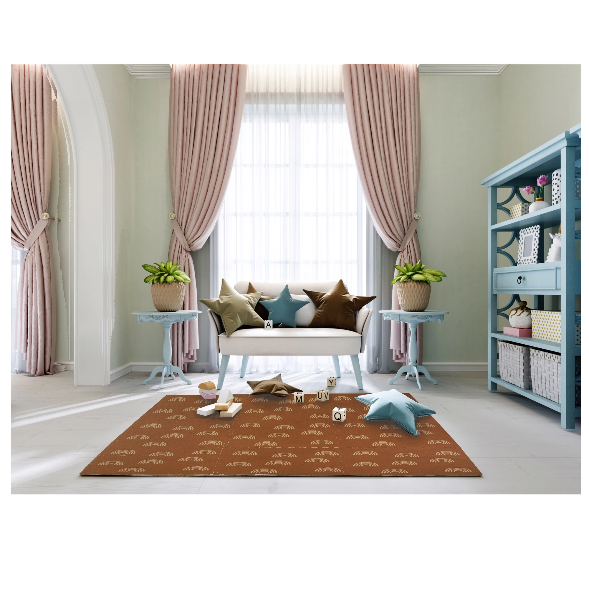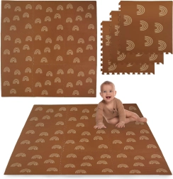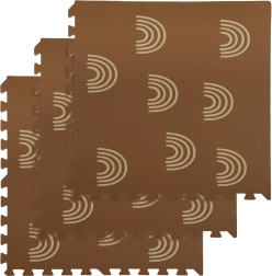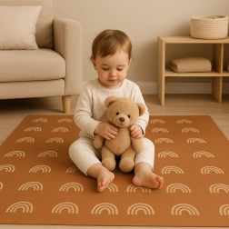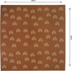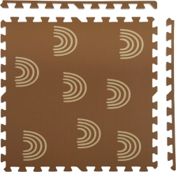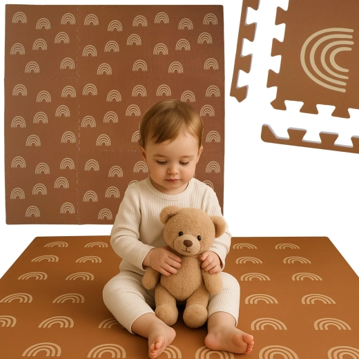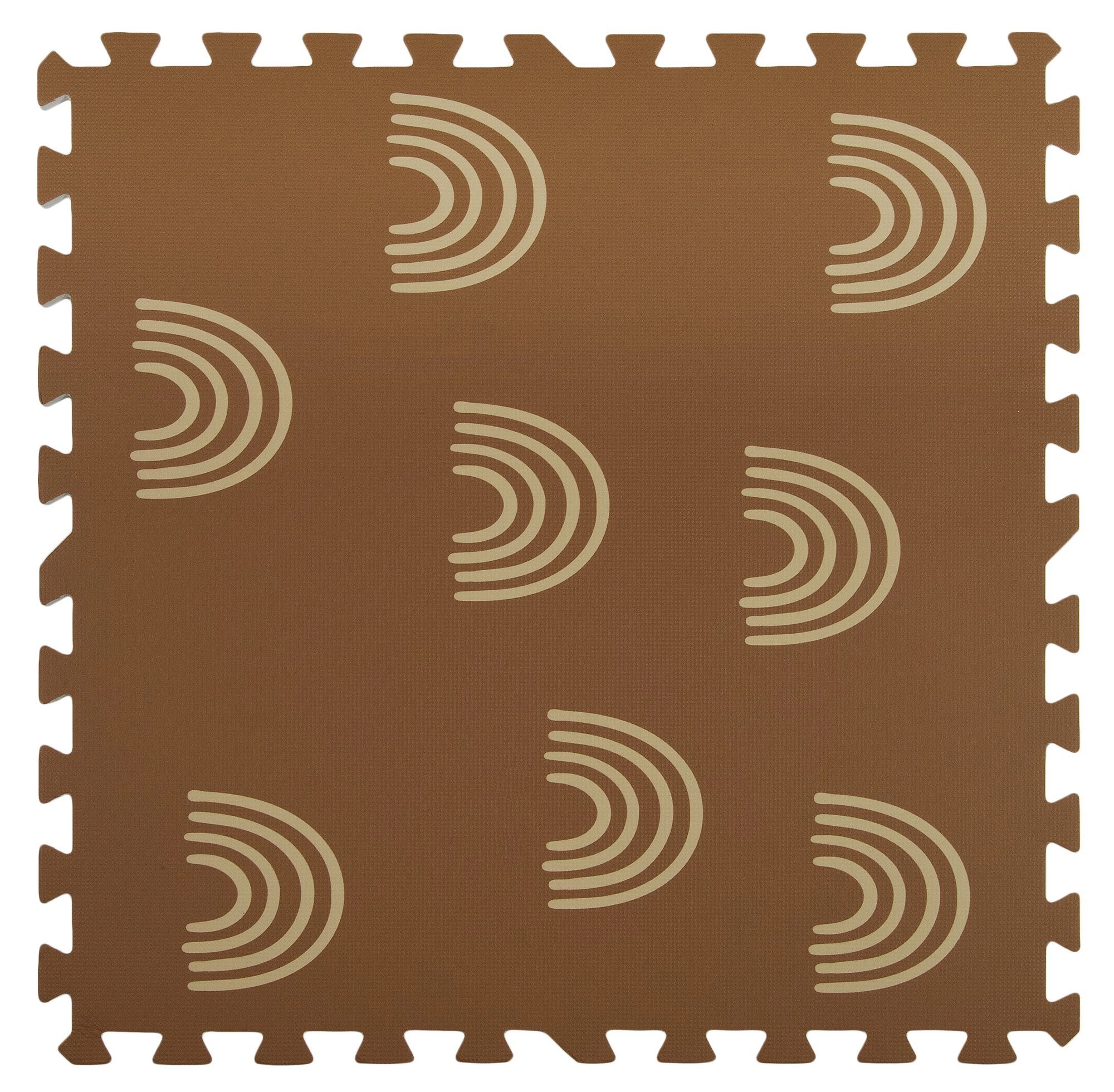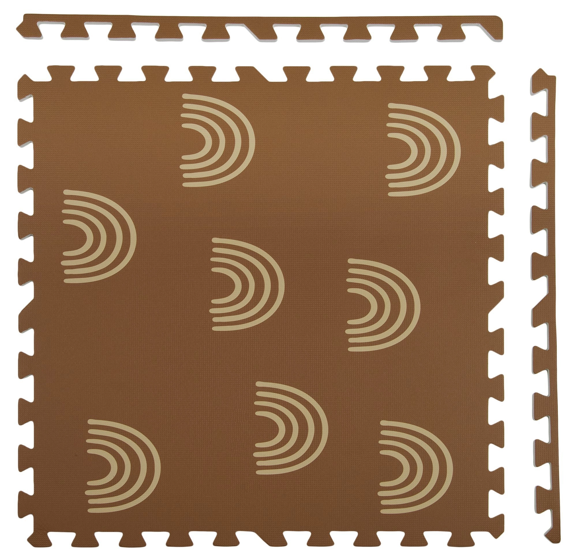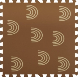 La alfombra de espuma HUMBI con motivo de suaves arcos de arcoíris en un tono marrón neutro combina con cualquier interior y protege tanto al niño como al suelo. Gracias a su grosor de 1 cm, amortigua los impactos y aísla del frío, por lo que es ideal para parquet, baldosas y laminado. Las piezas con encajes tipo puzle se unen fácilmente para crear una superficie mayor o adaptarse a zonas estrechas.