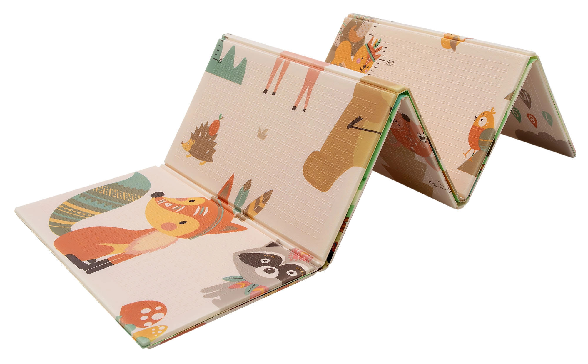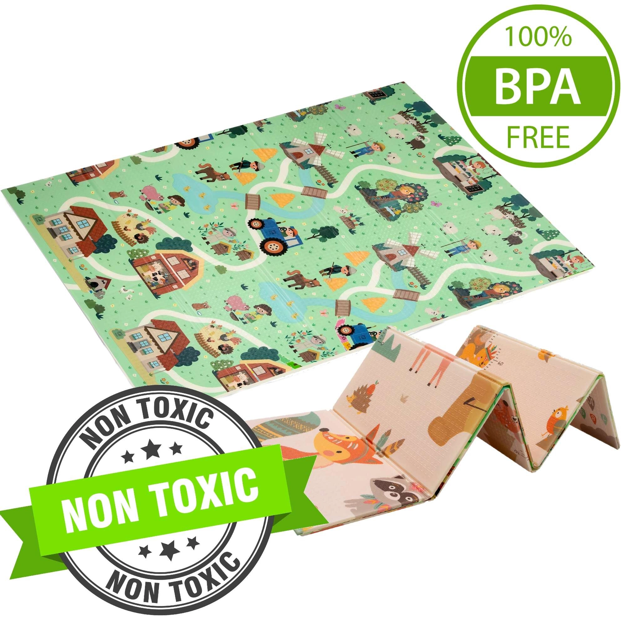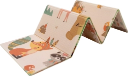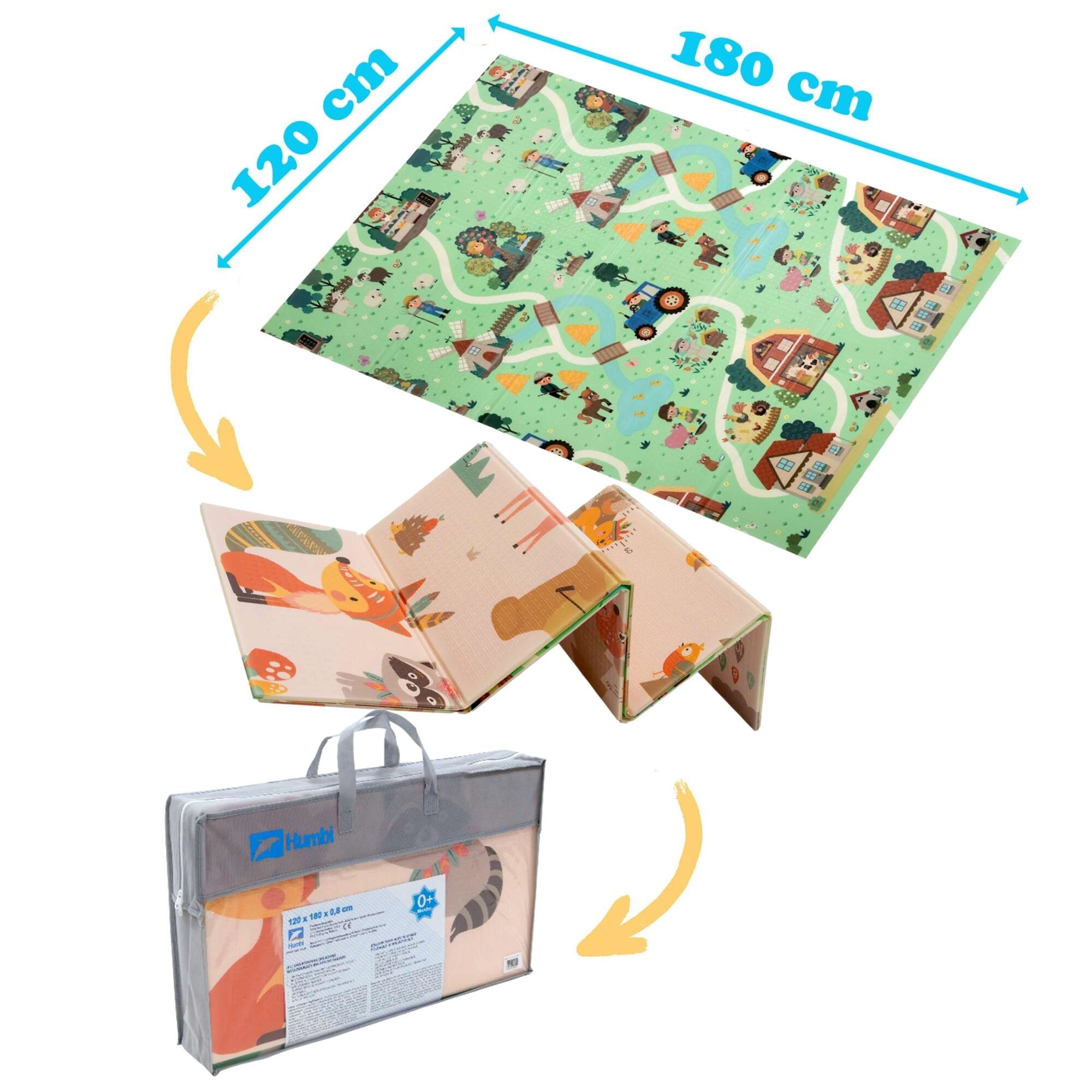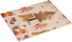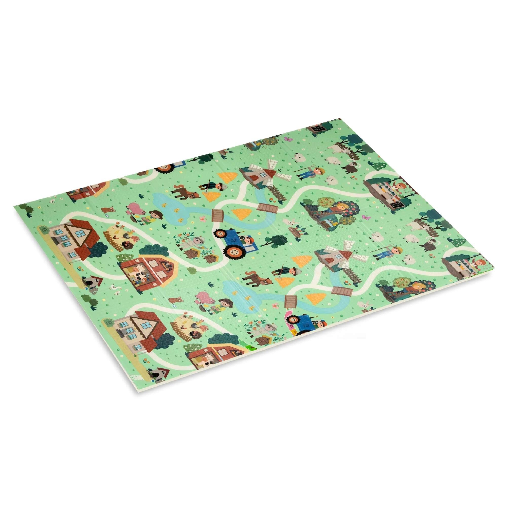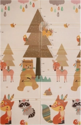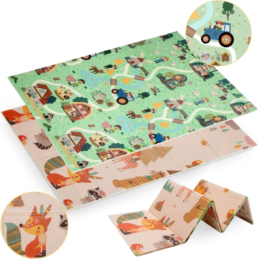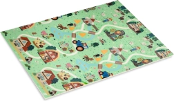 Un lado muestra animalitos del bosque, el otro un pueblo con carreteras para cochecitos. Alterna los motivos según el ánimo y estimula la imaginación y la percepción sensorial.
