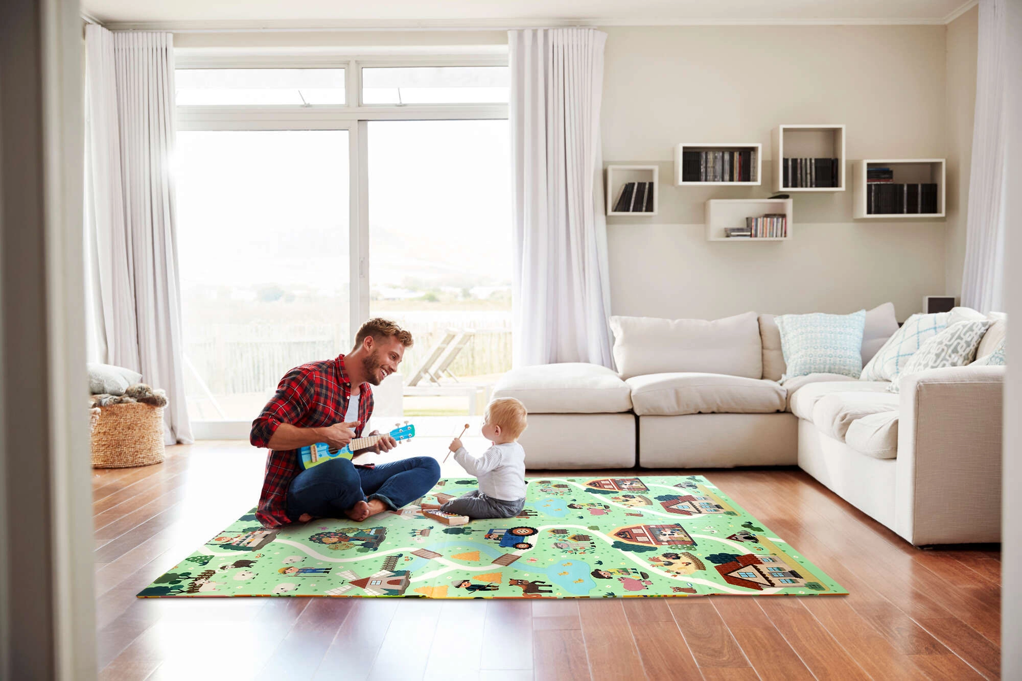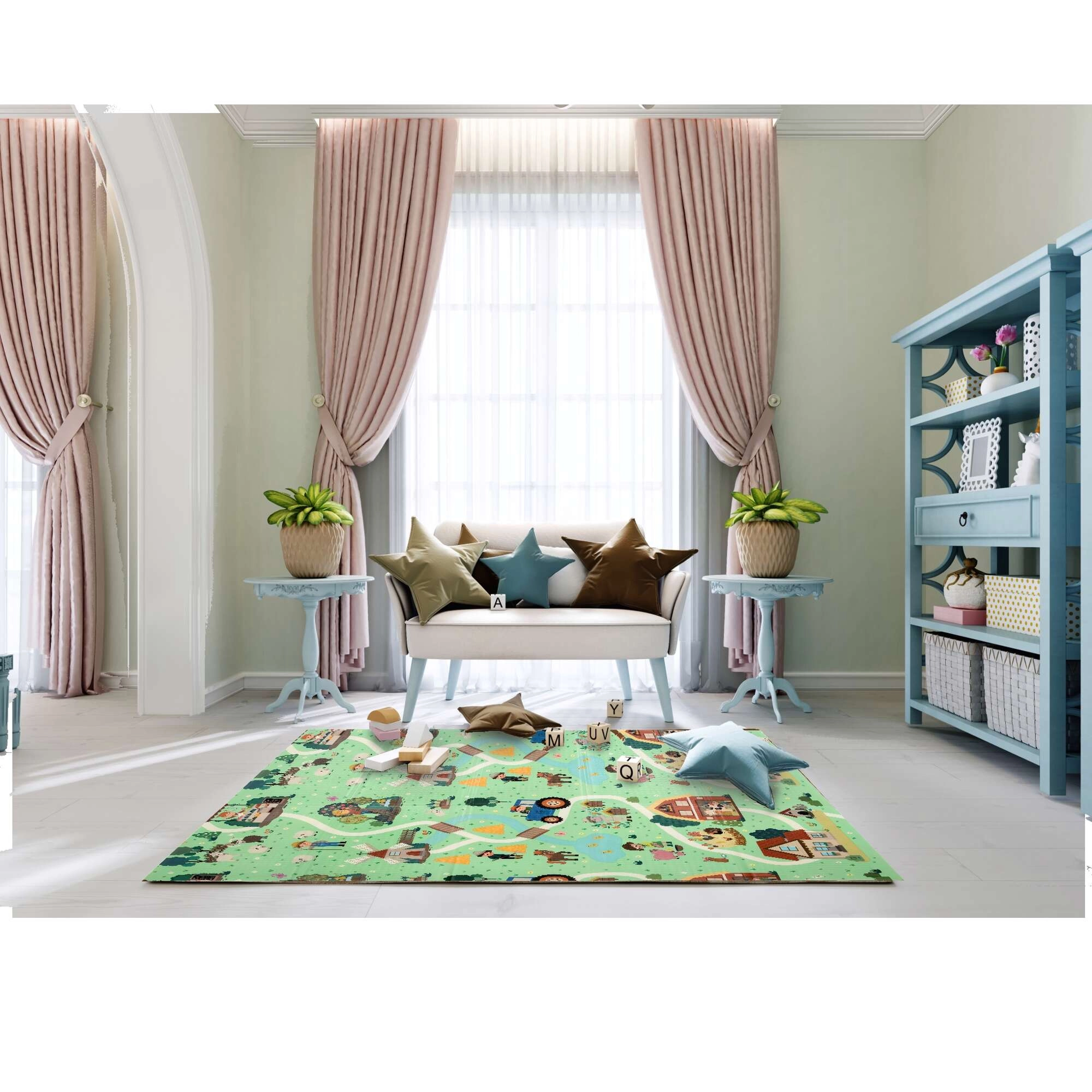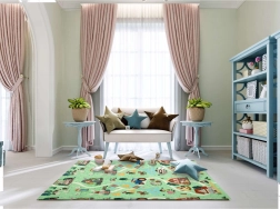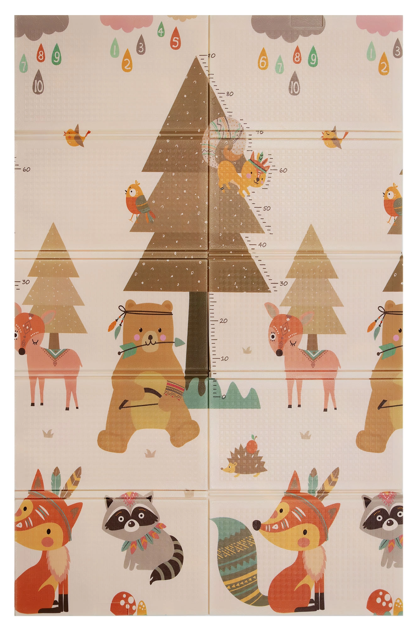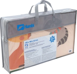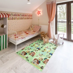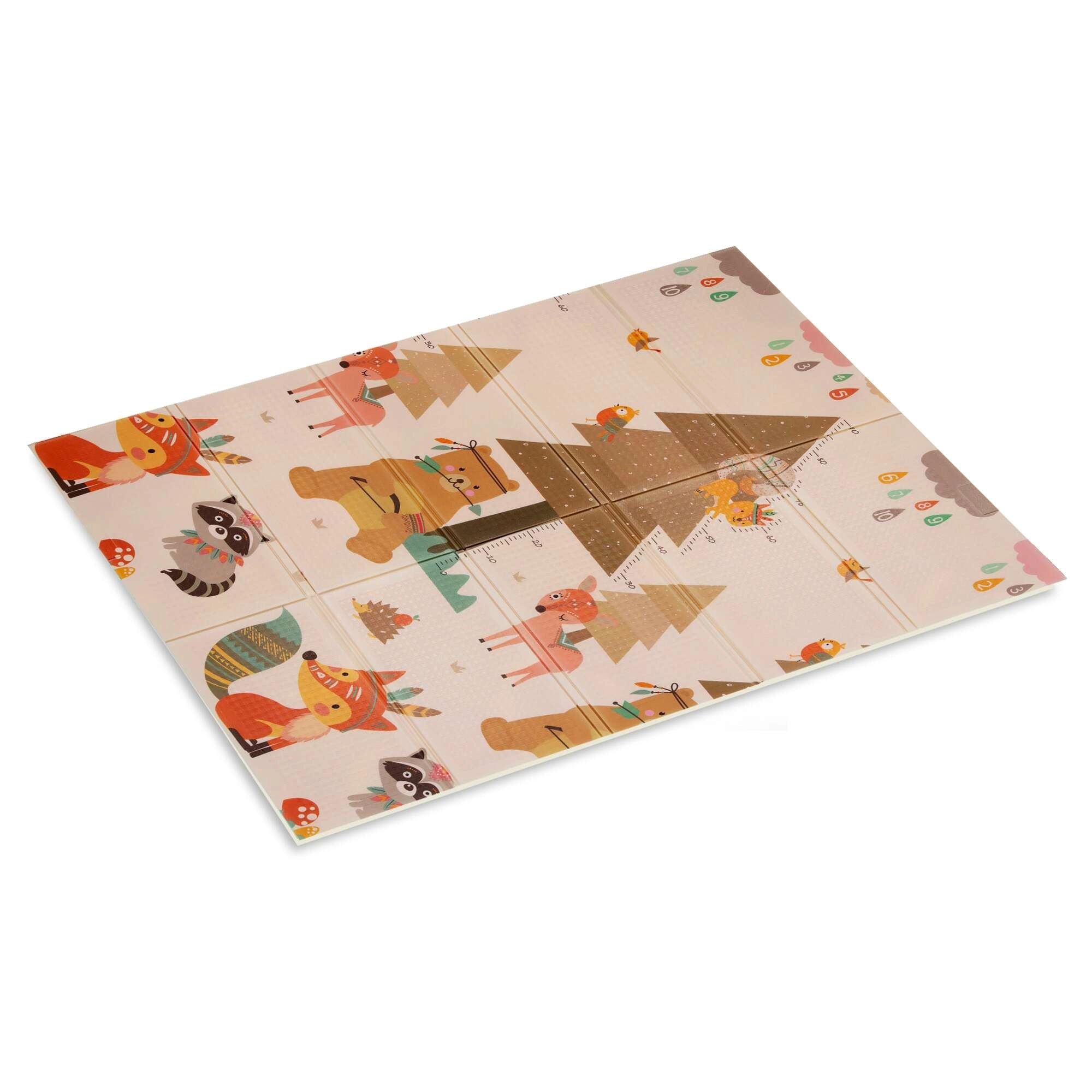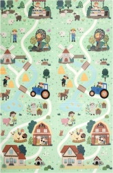 Un lado muestra animalitos del bosque, el otro un pueblo con carreteras para cochecitos. Alterna los motivos según el ánimo y estimula la imaginación y la percepción sensorial.