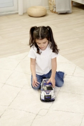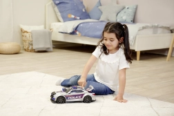 Gracias a la carrocería de plástico resistente y a las ruedas grandes, el coche es estable y está listo para el juego diario en interiores. Ideal como regalo para pequeños amantes de la acción y la velocidad.