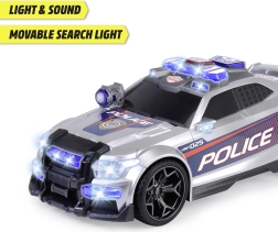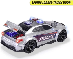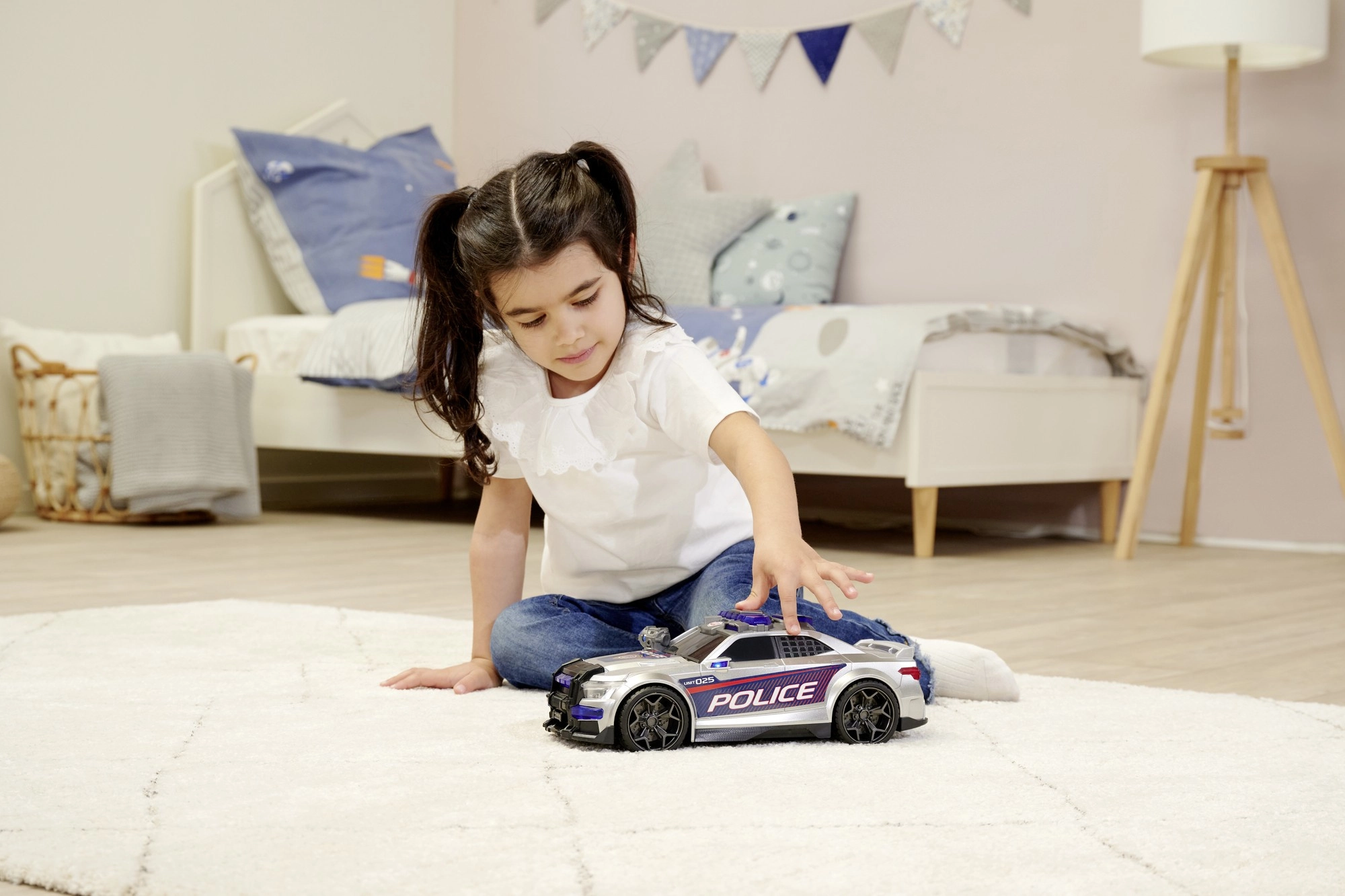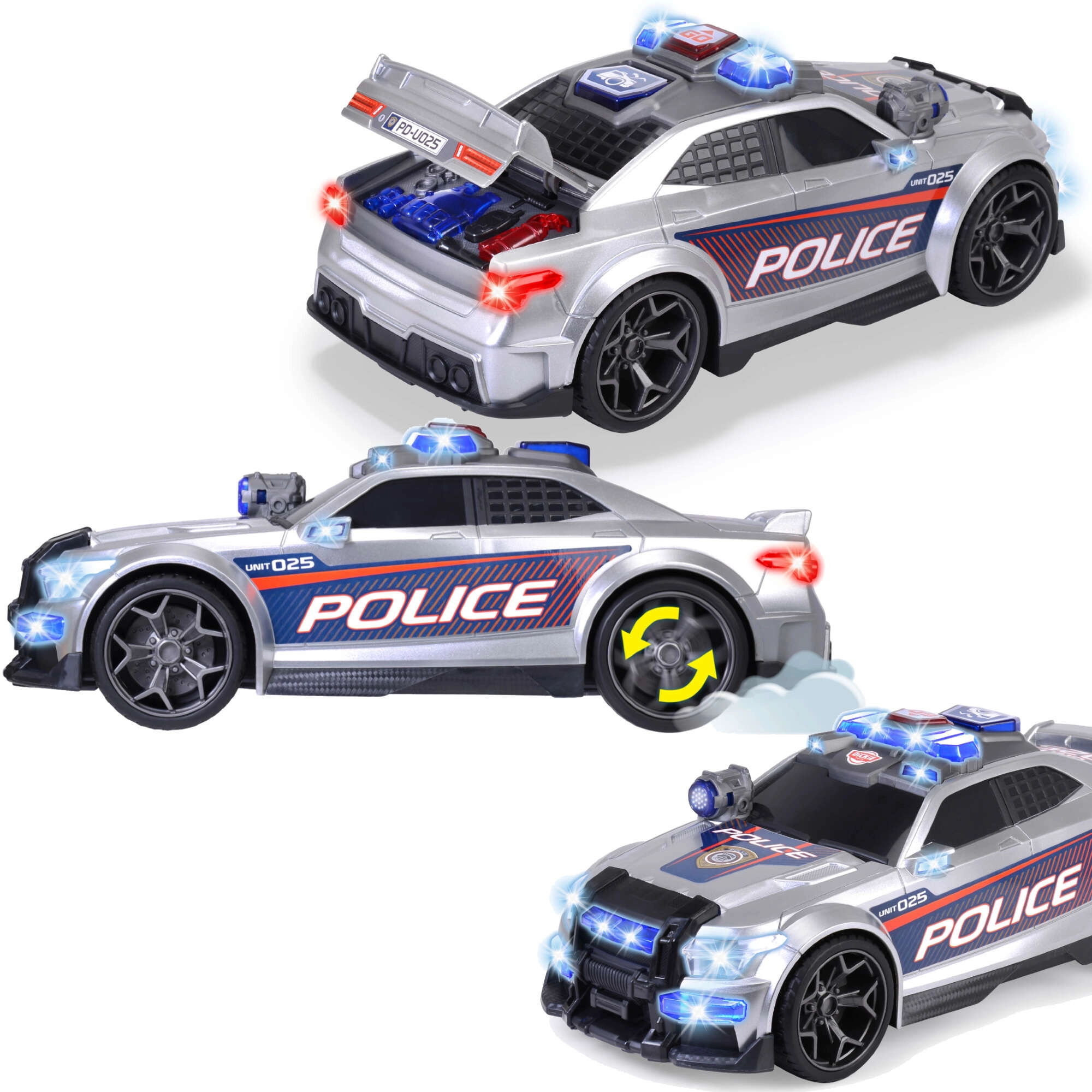 El estiloso coche de policía Street Force de DICKIE TOYS ofrece a los niños una diversión de acción realista. Cuenta con efectos de luz y sonido, una construcción robusta y ruedas grandes para un desplazamiento suave por el suelo. La activación se realiza con un botón en el techo, que enciende luces azules y rojas y activa las sirenas, ideal para juegos de rol de policías.