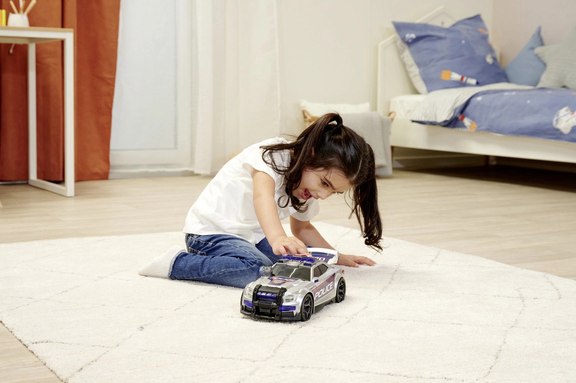 El vehículo de policía Street Force destaca por su diseño plateado y azul con llamativos rótulos POLICE, una barra de luces realista y ruedas resistentes. Los niños apreciarán el manejo sencillo: basta con pulsar el botón del techo para activar las luces y sonidos, recreando fielmente la atmósfera de una intervención.