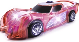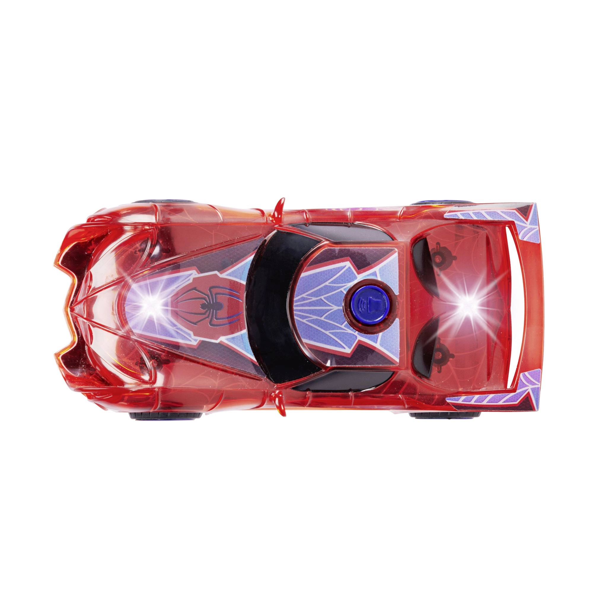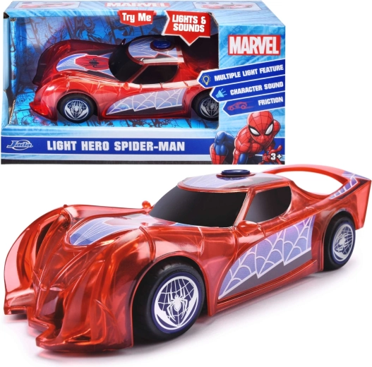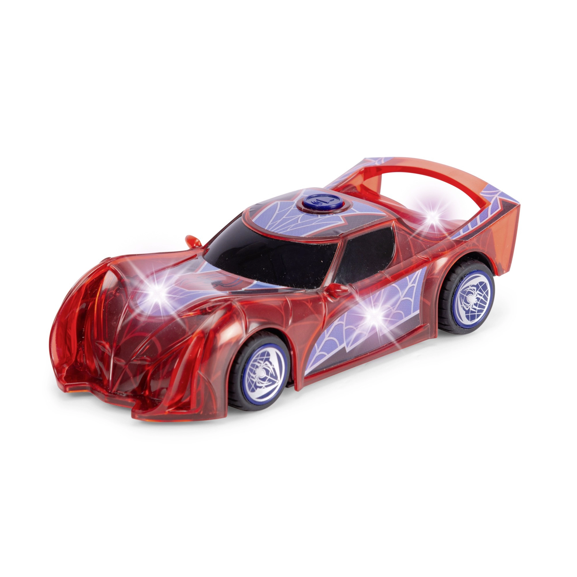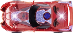 El coche de superhéroe SPIDER‑MAN en su característico color rojo y con detalles de telaraña destaca por su diseño translúcido y las luces LED integradas que iluminan cada aventura. El sencillo mecanismo push‑and‑go (propulsión por fricción) solo necesita un ligero empujón para salir hacia adelante.