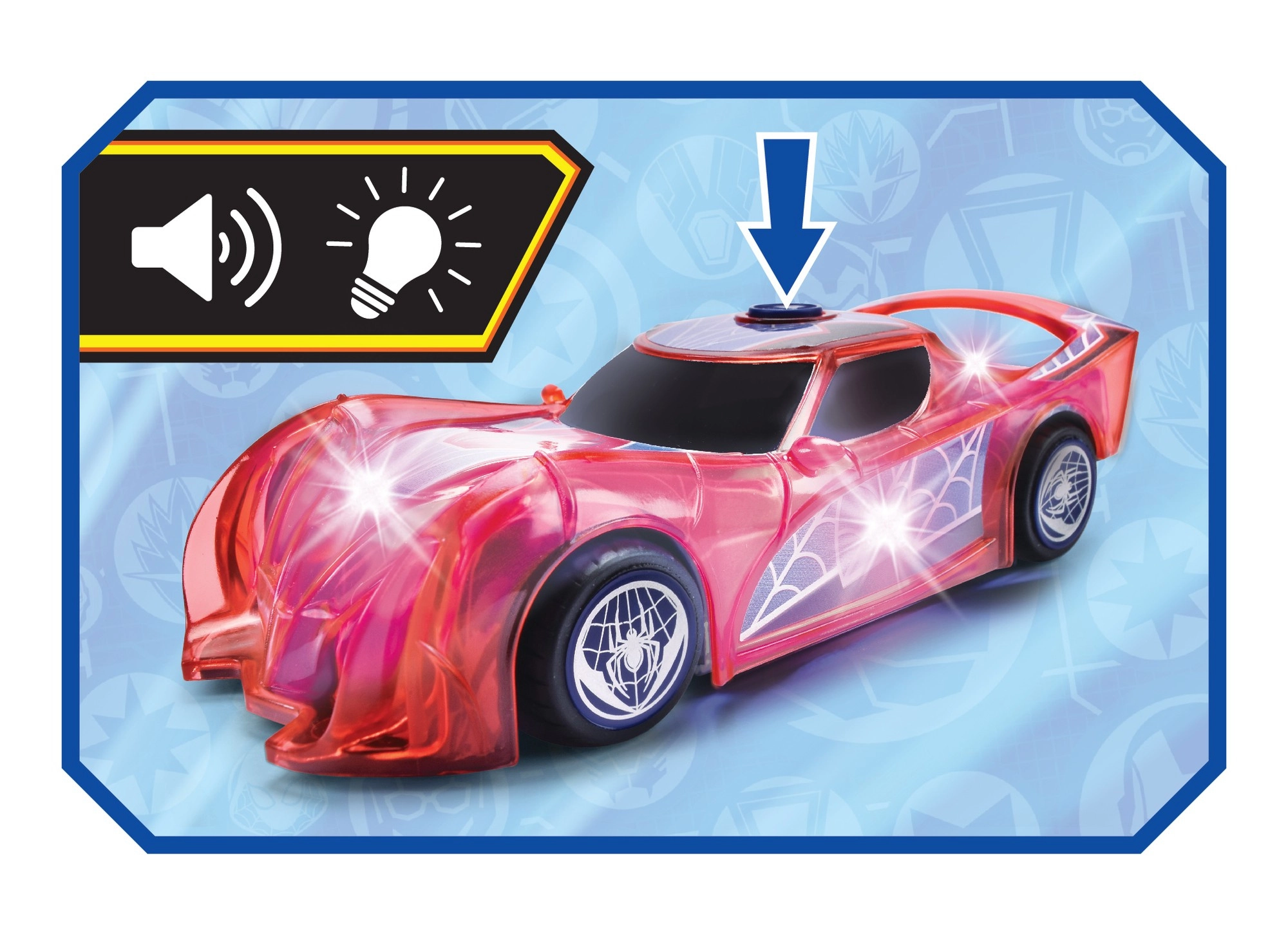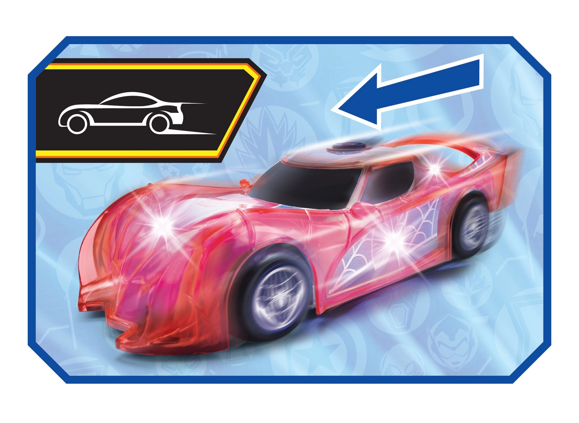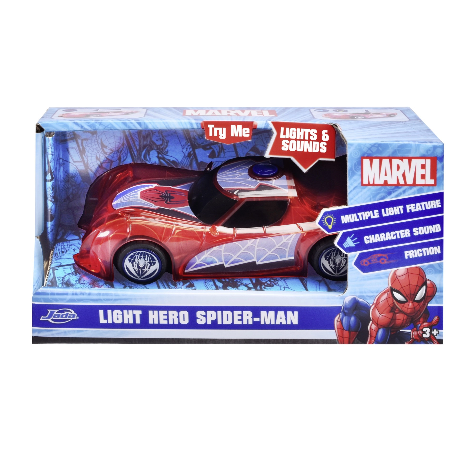 El coche de superhéroe SPIDER‑MAN en su característico color rojo y con detalles de telaraña destaca por su diseño translúcido y las luces LED integradas que iluminan cada aventura. El sencillo mecanismo push‑and‑go (propulsión por fricción) solo necesita un ligero empujón para salir hacia adelante.